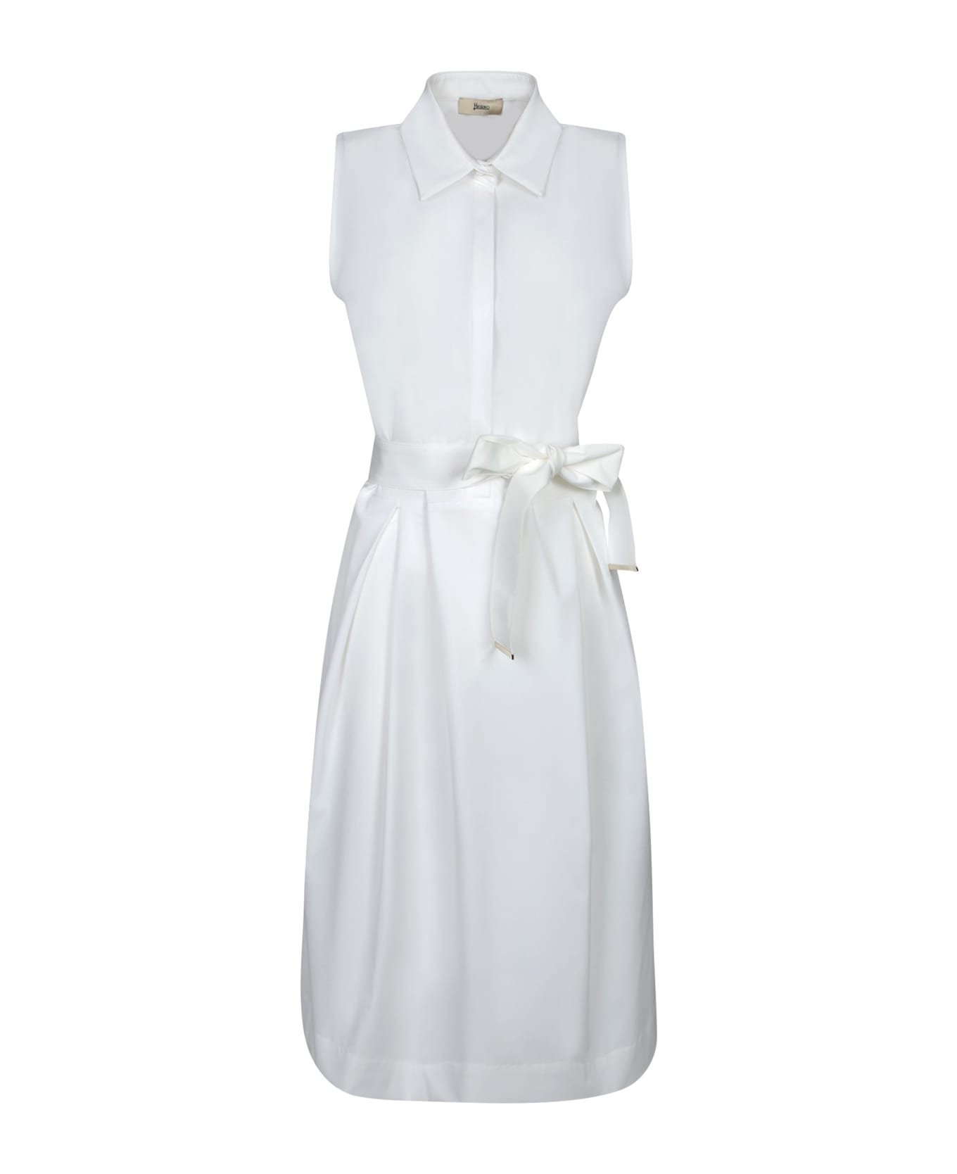 White Sleeveless Dress With Classic Collar And Adjustable Belt In Tech Fabric Stretch Woman