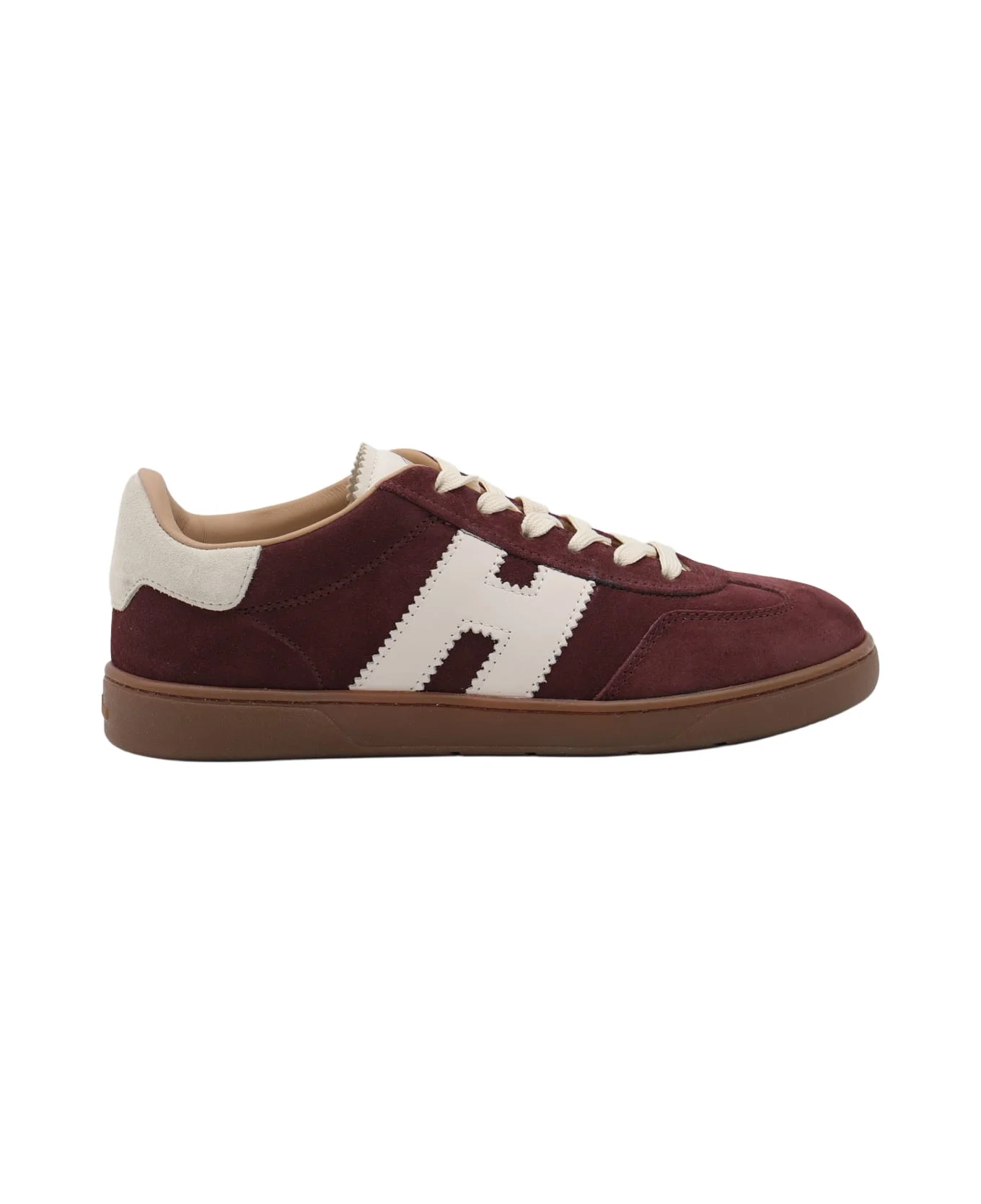 Dark red leather sneakers from Hogan featuring round toe, laces fastening, leather sole and lateral logo detail. Composition: _cover, 100% Le Sole, 100% Elastodiene Made in: Italy Color: bordeaux Model number: HXW6470FB60UHK0GAG0GAG