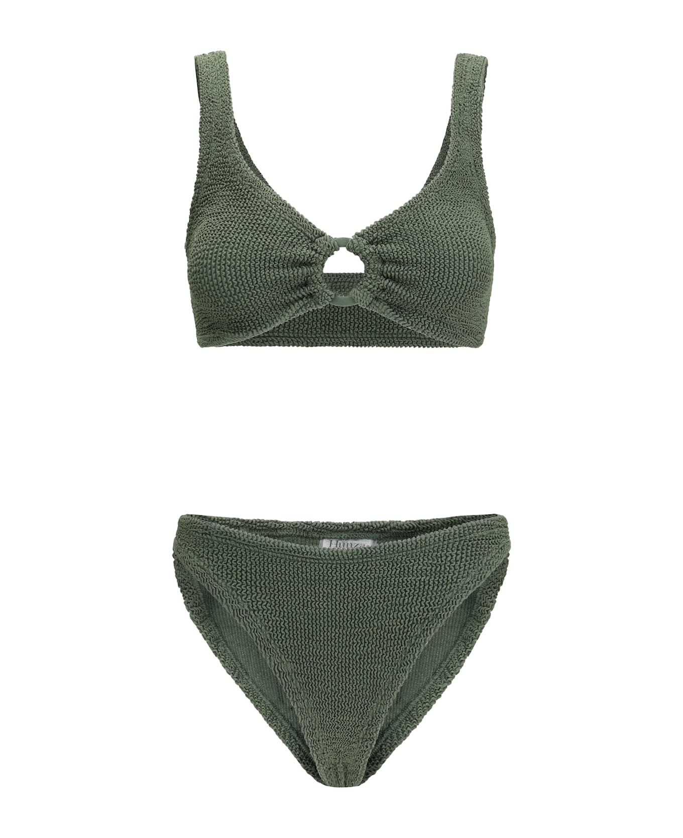 The julia swimsuit by hunza g is ideal for those seeking a sophisticated and modern look. the bikini model is composed of low-waisted bottoms and a top with straps, enriched by a cut-out detail with a ring on the front, which adds a touch of distinctive style. the exclusive original crinkle workmanship allows the fabric to stretch to flex, sculpt and support every curve, adapting perfectly to all body types, ensuring a unique fit. Composition: 100% % Polyamide Made in: Morocco Color: Metallic Khaki Model number: BJULIATXMETALLIC