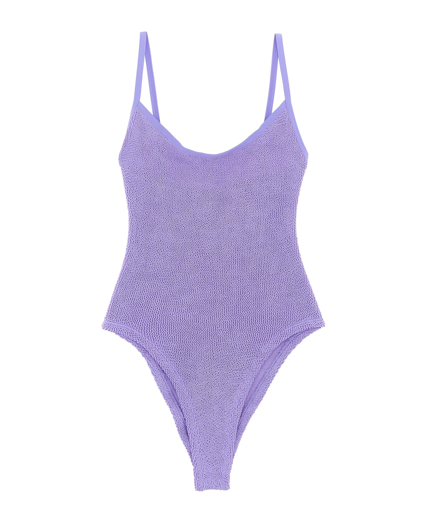 'Pamela' seamless crinkle fabric one-piece swimsuit with thin straps, front square neckline, and high-leg. Composition: 97% polyamide 3% elastane Made in: United Kingdom Color: Purple Size and fit: - One size Model number: PAMELASWIMLILAC