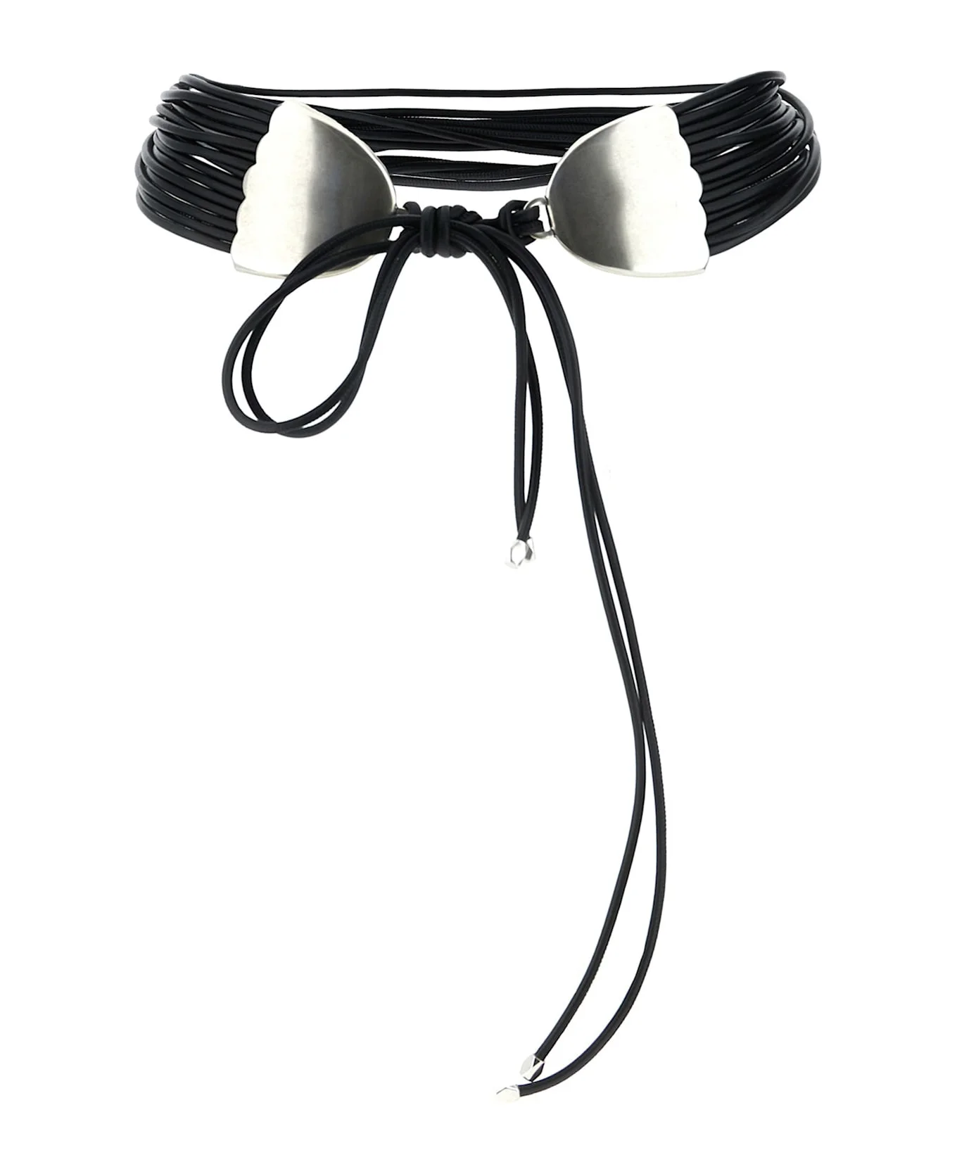 'Brandy' lambskin belt, multi-row construction to tie with rounded shell style detail in silver brass on the front, adjustable closure with lanyards and faceted pearls. Composition: 70% lamb leather 30% brass Made in: Italy Color: Black Size and fit: - H 6 cm Model number: CE309BFAC1A01ABKSI