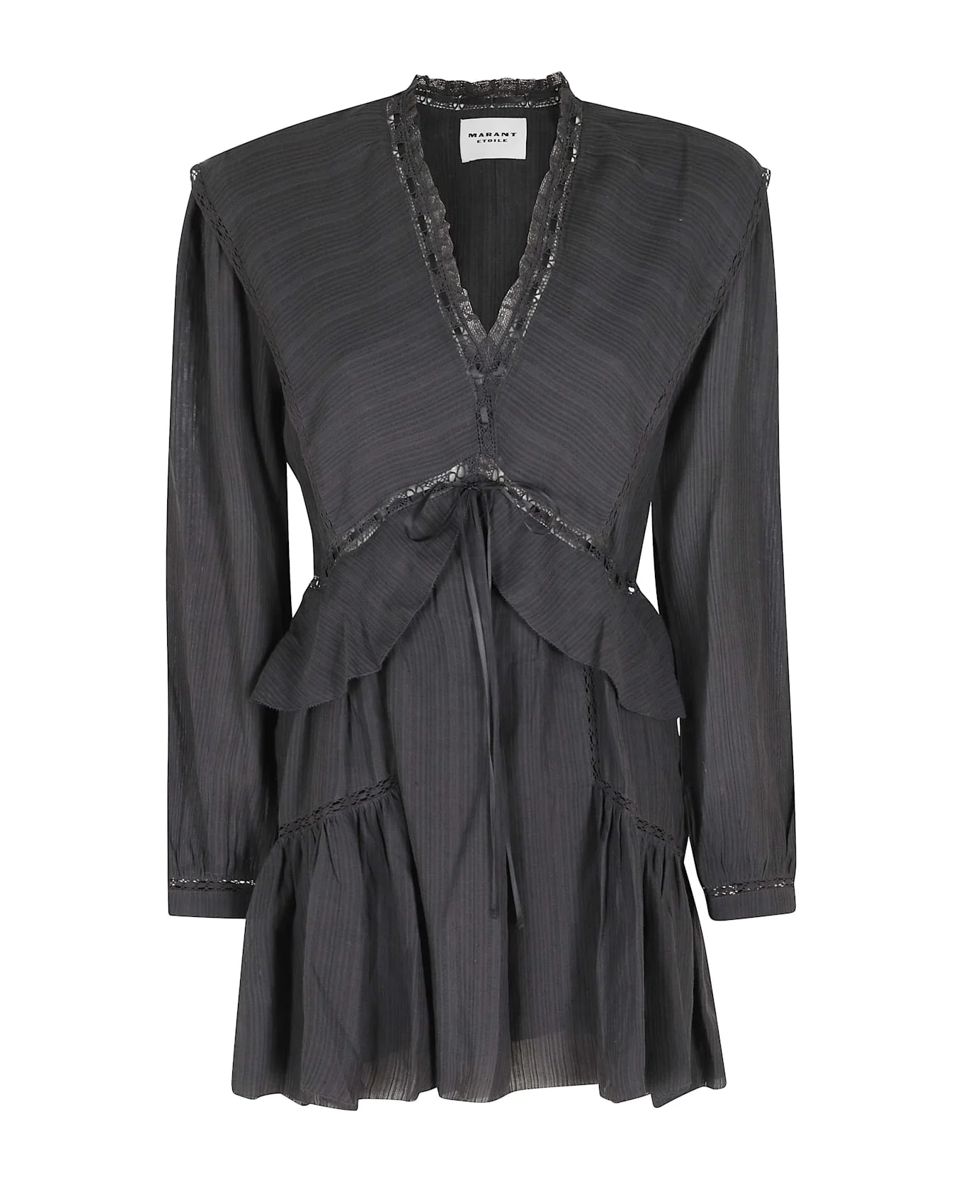 Category: Dress Item: Mini Damya GA Dress Brand: Marant Etoile Color: Black Neckline: Deep V-neckline Details: Lace trim, ruffles and adjustable bow at the waist SIZE AND FIT Fit: Regular Sleeve: Long with button and lace Made in: India Color: Bk Model number: RO0974FAD1J11E|098