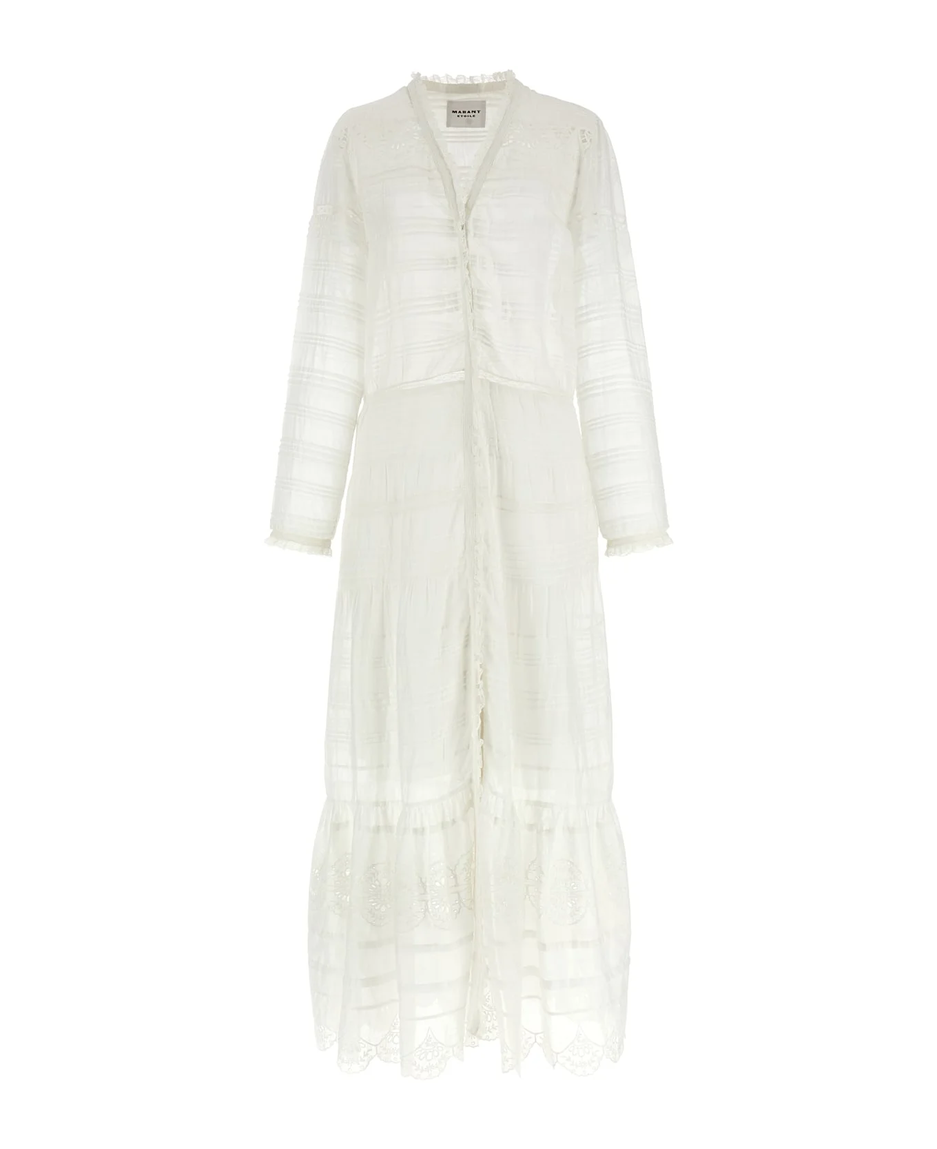 Long 'Daniva' dress in light cotton with lace inserts at the crochet I see I do not see and details in sangallo, V-neck, front hidden button closure, long sleeves with cuffs, flounce on asymmetrical hem, lining. Composition: 100% cotton Made in: India Color: White Size and fit: - true to size fit - FRENCH size Model number: RO0723FBD1J05E20WH