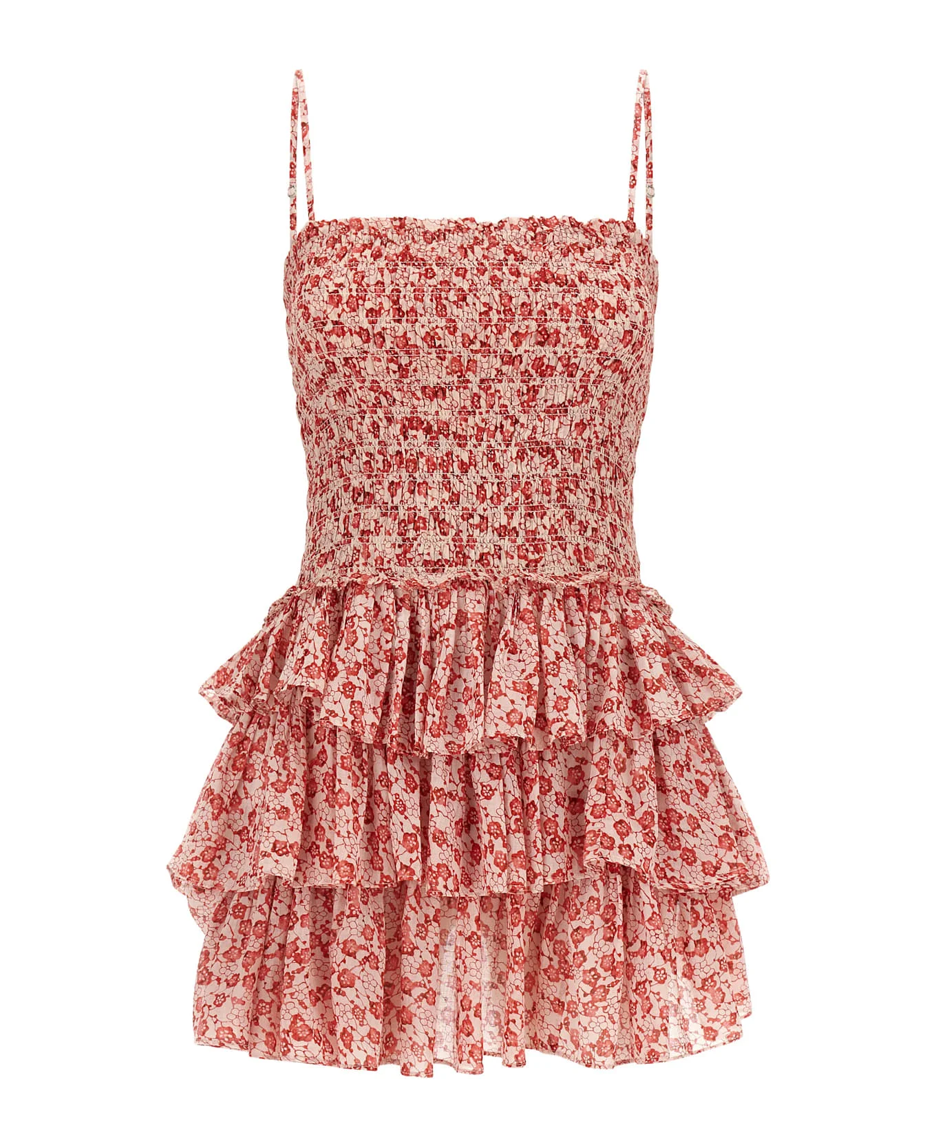 'Elodie' mini dress in cotton with all-over floral print, smock stitch elastic, thin adjustable straps, ruffles with curls. Composition: 100% cotton Made in: India Color: Red Size and fit: - True to size fit French sizing Model number: RO1056FAD1J15E70RD