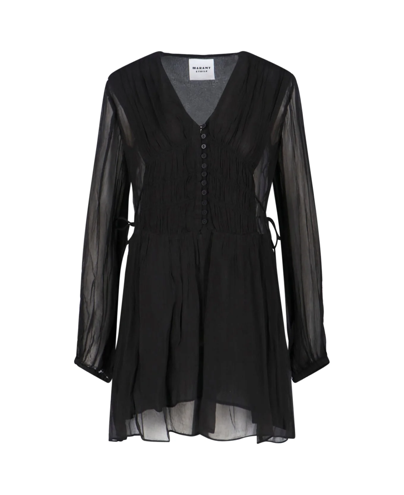 Isabel Marant etoile Loriena mini dress in black viscose with V-neck, front button closure, all-over curled workmanship, two adjustable side laces, wide sleeves, elasticated cuffs, and asymmetrical hem. Composition: 100% Viscose Made in: India Color: Black Size and fit: - Vestibilita regolare Model number: RO0969FAD1J08E01BK