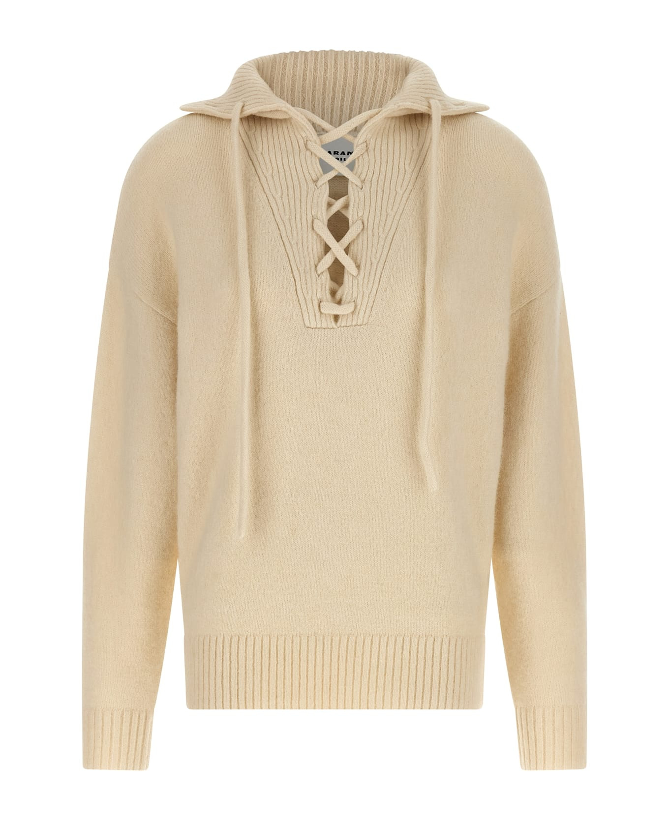 'Phylia' alpaca blend sweater with collar, V-neck with adjustable laces detail, long sleeves with cuffs and dropped shoulders. Composition: 62% alpaca wool 33% polyamide 5% elastane Made in: China Color: White Size and fit: - comfort fit - FRENCH size Model number: PU0724FAA1L68E23EC