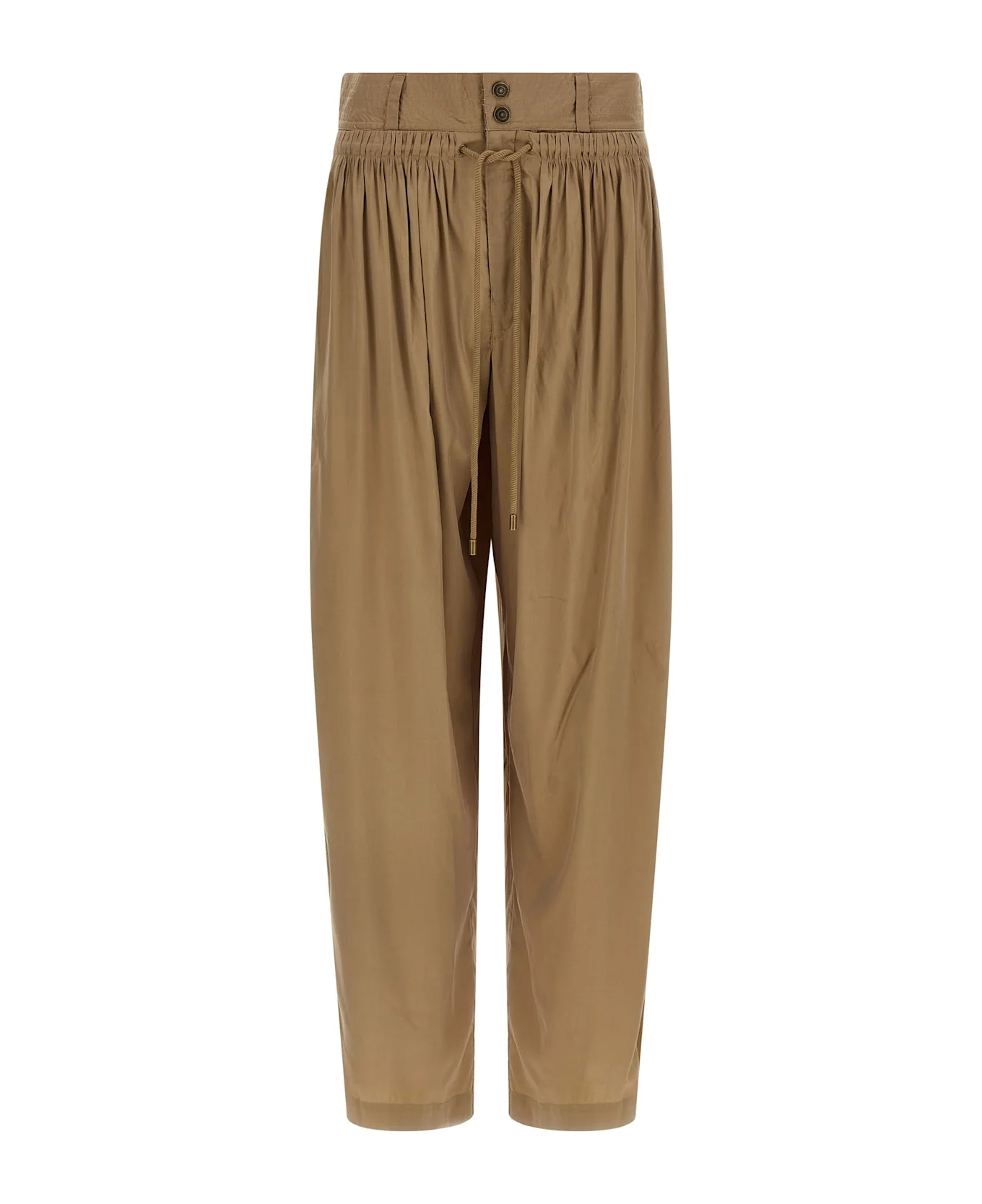 'Inaya' trousers in lightweight fabric, high waist trompe l'-oeil model with double band and belt loops, curled with elastic and drawstring, button closure, wide and straight leg, side and back pockets Composition: 75% modal 25% polyamide Made in: India Color: Green Size and fit: - True to size fit French sizing Model number: PA0547FCD1I03I67KI