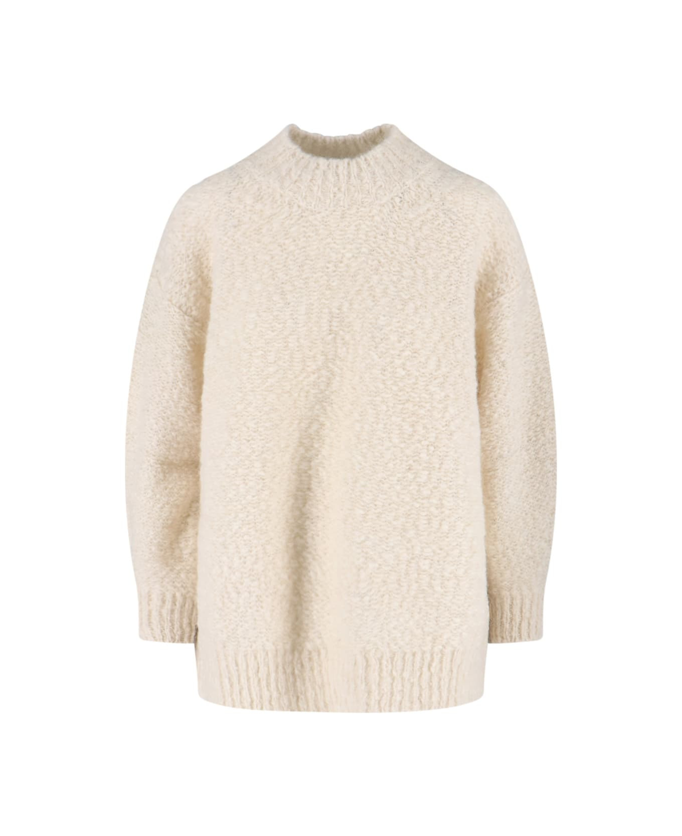 Isabel Marant oversized sweater in cream alpaca blend with knit, high neck, ribbed trim, dropped shoulders, straight hem. Composition: 87% Alpaca, 13% Polyamide Made in: Italy Color: Ec Ecru Size and fit: - Vestibilita oversize Model number: PU0760FAC3L07I