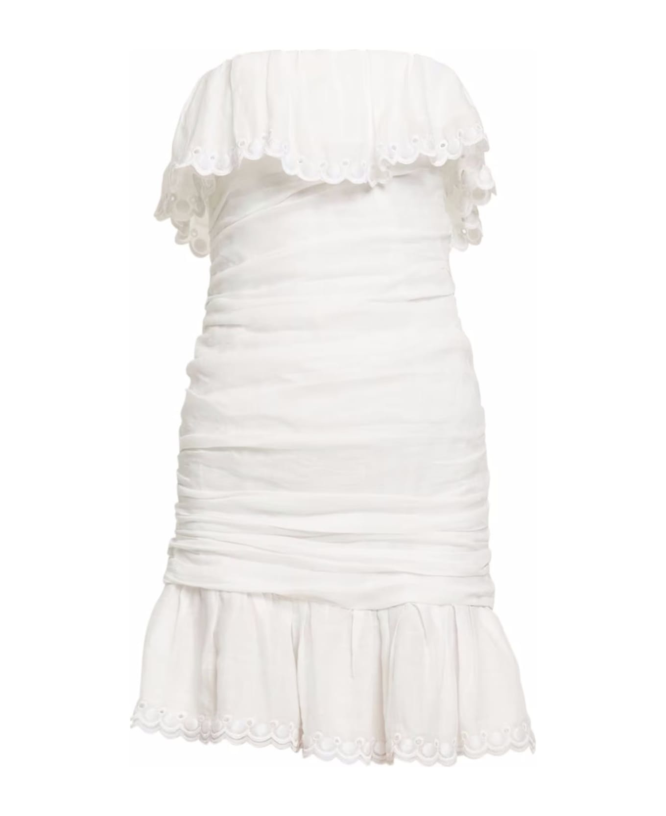 White ramie minidress, ruched detailing, off-shoulder, scallop hem, thigh-length Composition: Ramie, 100% Made in: India Color: White Size and fit: - This piece fits true to size. We recommend you get your regular size - Model is 1,75m / 5ft 8in wearing size 36 (FR) Model number: RO0086FAA1J38IOXANI20WH