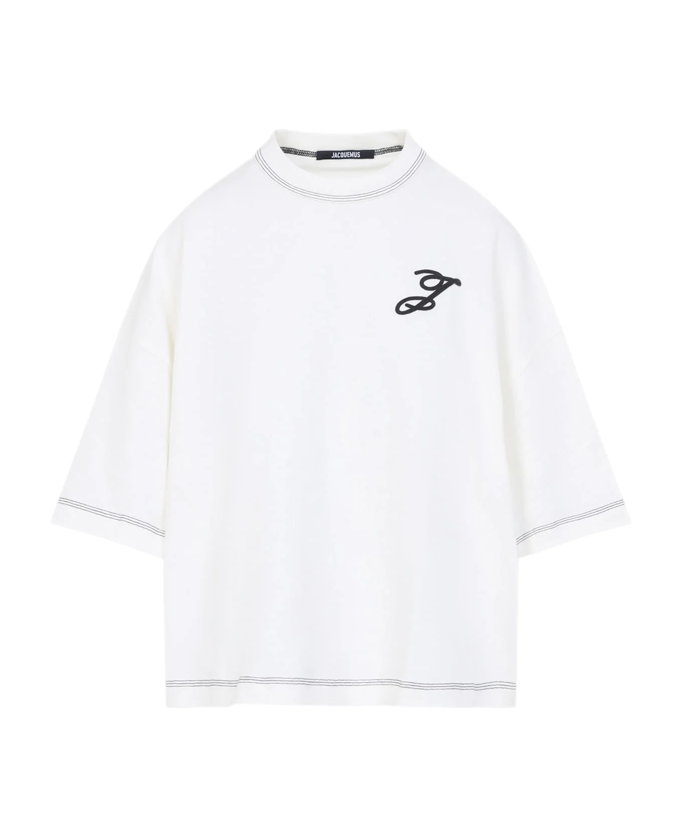 Jaquemus Off White Cotton T-shirt. Crafted from white cotton jersey with contrasting stitching, featuring a round neckline, logo embroidery on the chest, dropped shoulders, short sleeves, and a straight hem. Made in: Portugal Color: Off White Model number: TSW00580AJ00226110