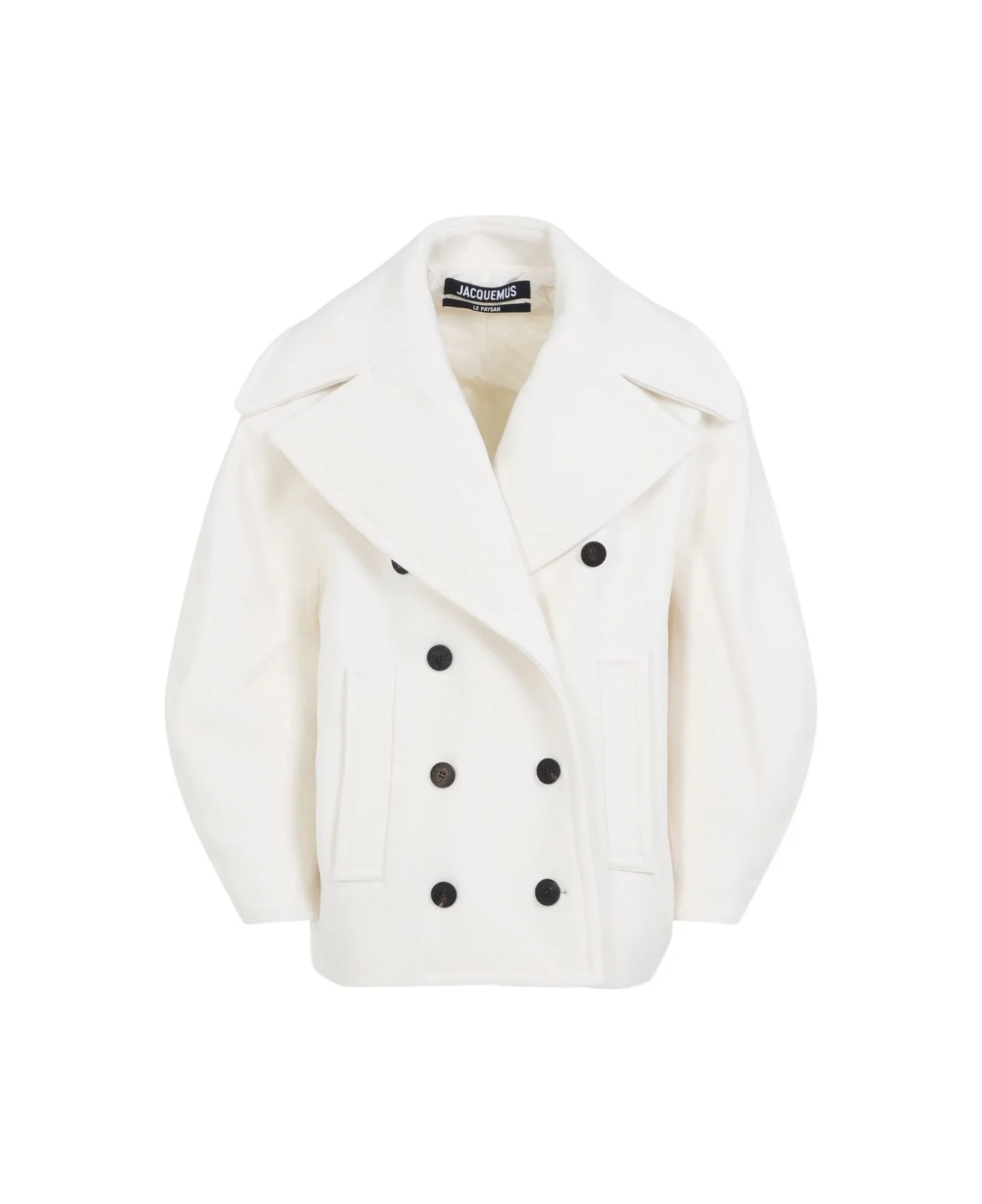 Jacquemus Double-breasted white wool coat with peak lapels Composition: Vi, 52% Cotton, 48% Virgin Wool, 100% Color: White Model number: COW00103AW00429110