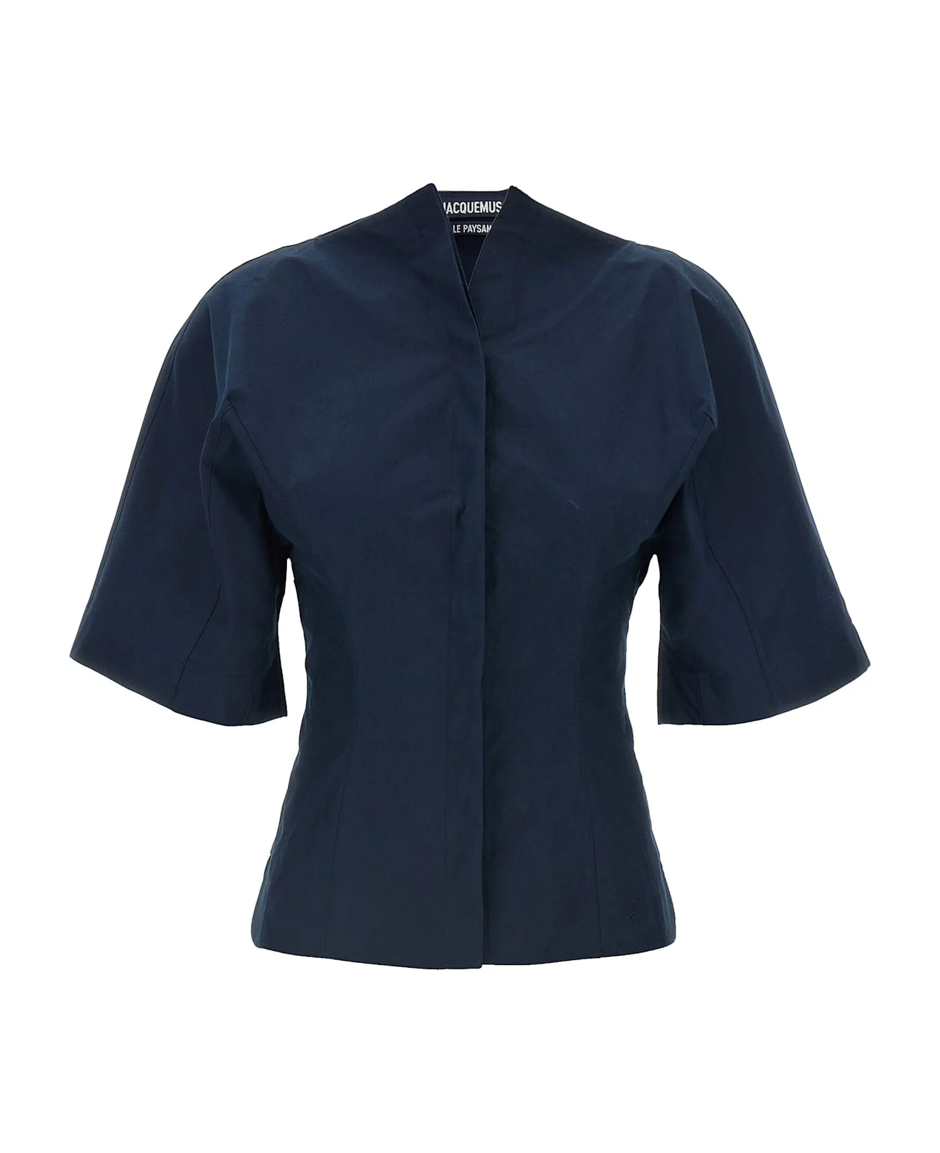 'La Chemise Moisson' compact cotton poplin shirt, hourglass silhouette with marked waist, boat neck, concealed mother-of-pearl button closure on the front, wide short sleeves, side slits on a rounded hem. Composition: 100% cotton Made in: France Color: Blue Size and fit: - slim fit - FRENCH size Model number: 26ESHW00560AW00648390
