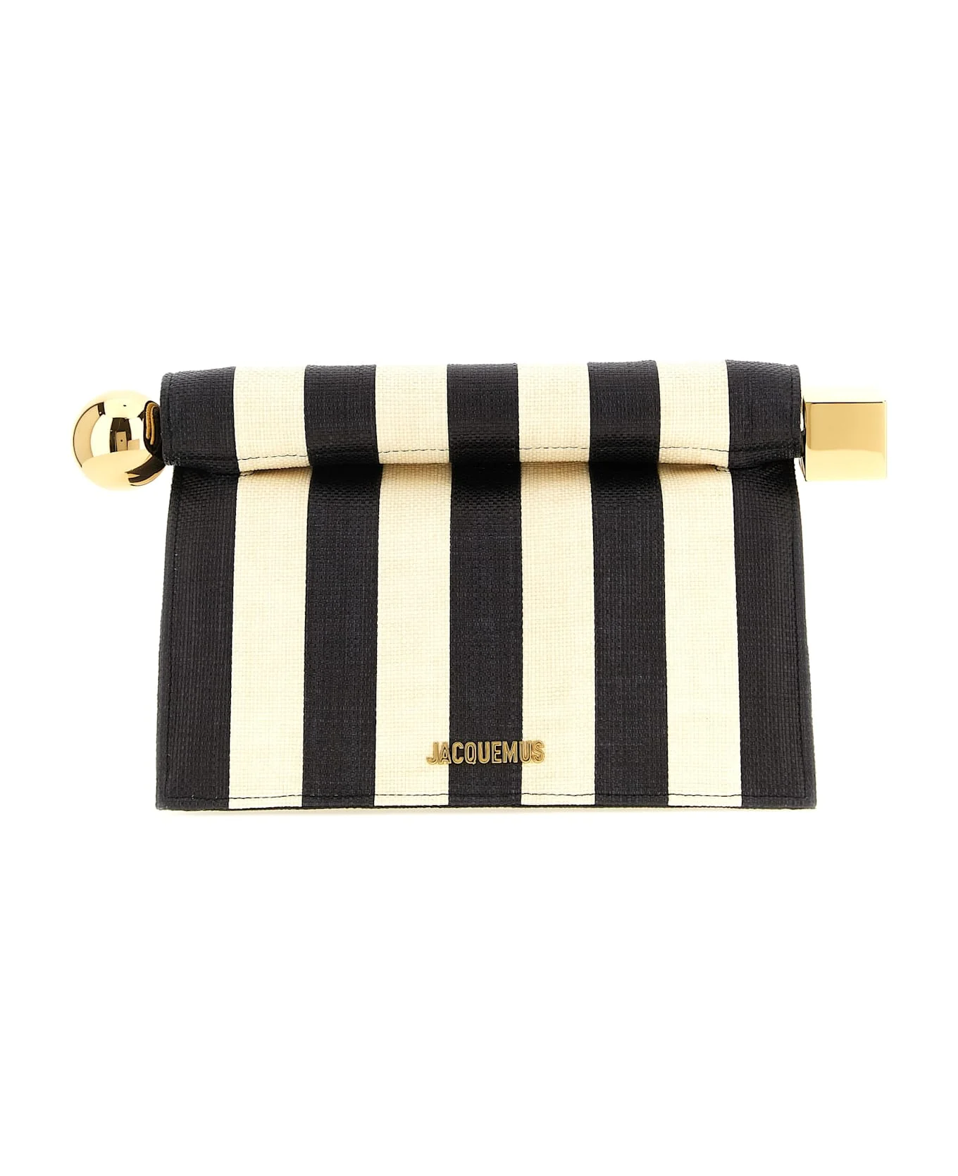 La Pochette Rond Carre' striped patchwork raffia clutch bag with lambskin details, front metal lettering logo, folded magnetic closure, side metal ball and cube detail, cotton lining. Composition: 100% polyamide Made in: Italy Color: Multicolor Size and fit: - W 27.7 x H 17 x D 12.20 cm Model number: 26EBAW00356AE000761FY
