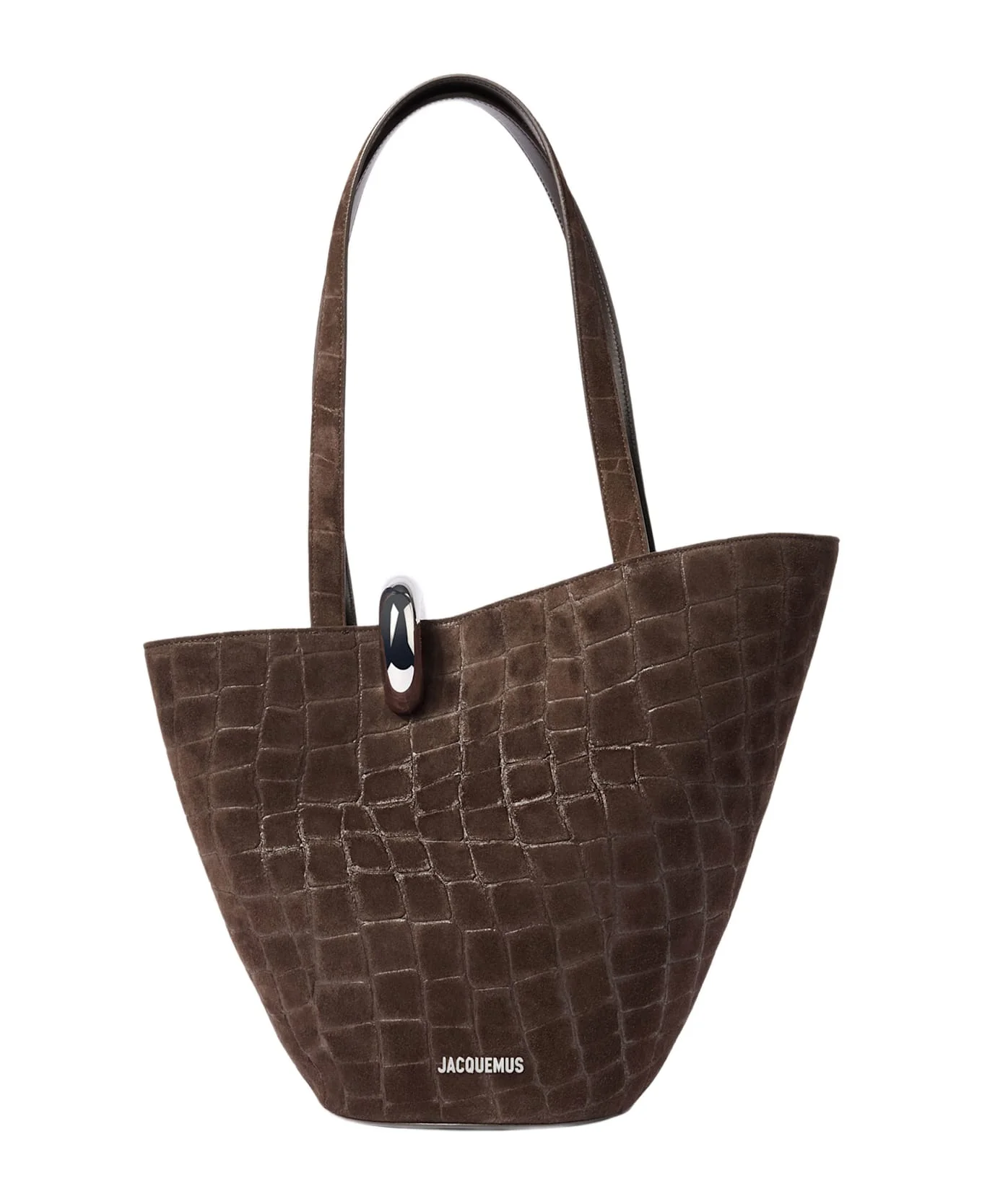 Asymmetric bucket bag in crocodile-effect leather. Double top handles and removable cross-body strap. Gold-tone ring clasp and metallic logo details. Fully lined in cotton with internal zipped pocket. Composition: 100% Cas Made in: Italy Color: Brown Size and fit: - 41 × 34,5 × 19 cm - Model number: BAW00412AC07A09880
