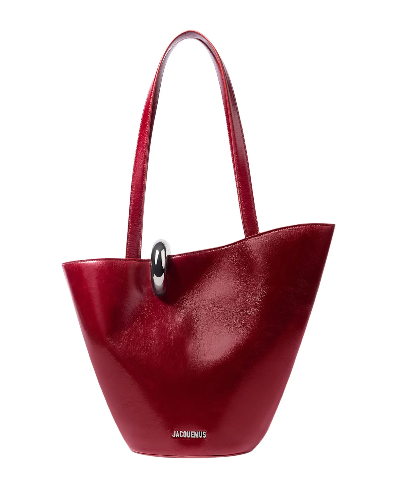 Asymmetric bucket bag in glossy leather. Double top handles and removable cross-body strap. Silver-tone ring clasp and metallic logo details. Fully lined in cotton with internal zipped pocket. Red color. Composition: 100% Cas Made in: Italy Color: Red Size and fit: - 41 × 34.5 × 19 cm Model number: BAW00412AC20C01490