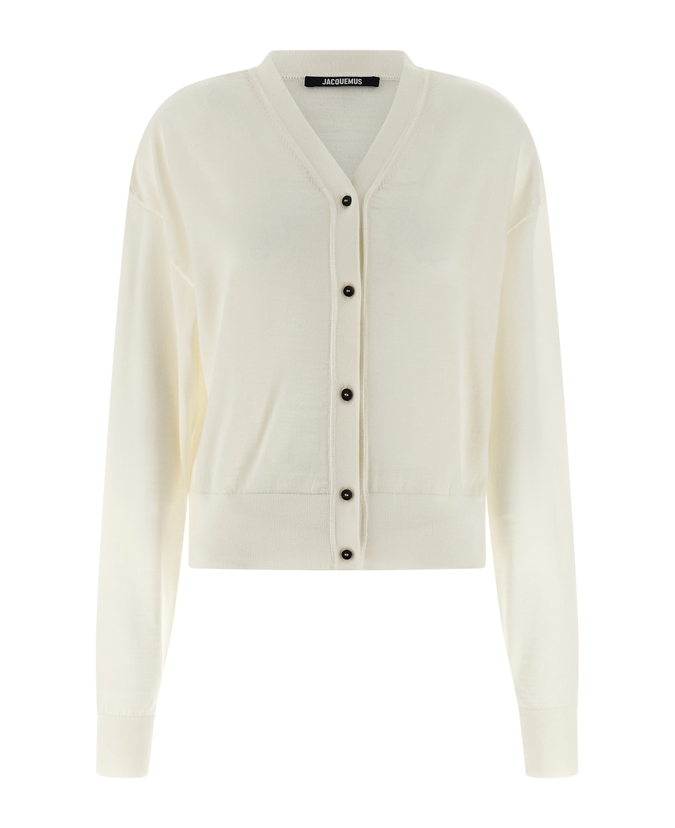 Le Cardigan Brode' merino wool cardigan with tone-on-tone embroidered logo at the back, V-neck, front button closure, long sleeves with cuffs and dropped shoulders. Composition: 90% merino wool 6% polyamide Made in: Portugal Color: White Size and fit: - true to size fit - FRENCH size Model number: 25HCDW00816AK00299110