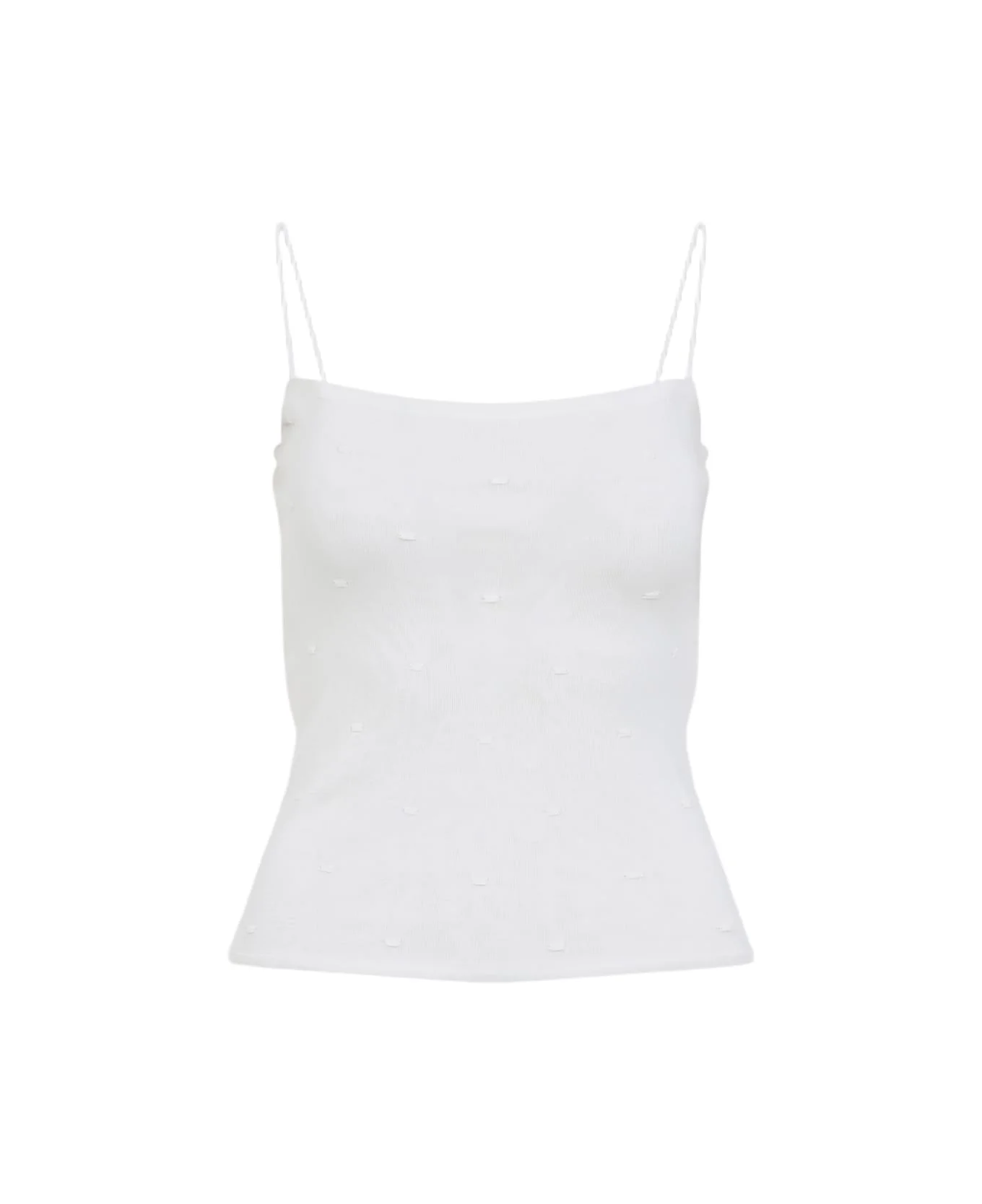 Jacquemus Off White The Plumetis Viscose Top. Crafted from semi-sheer off white viscose with a textured polka dot pattern, featuring a straight neckline, ultra-fine straps, and a draped back. Made in: Portugal Color: Off White Model number: TOW00901AK00317110