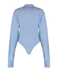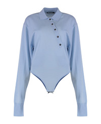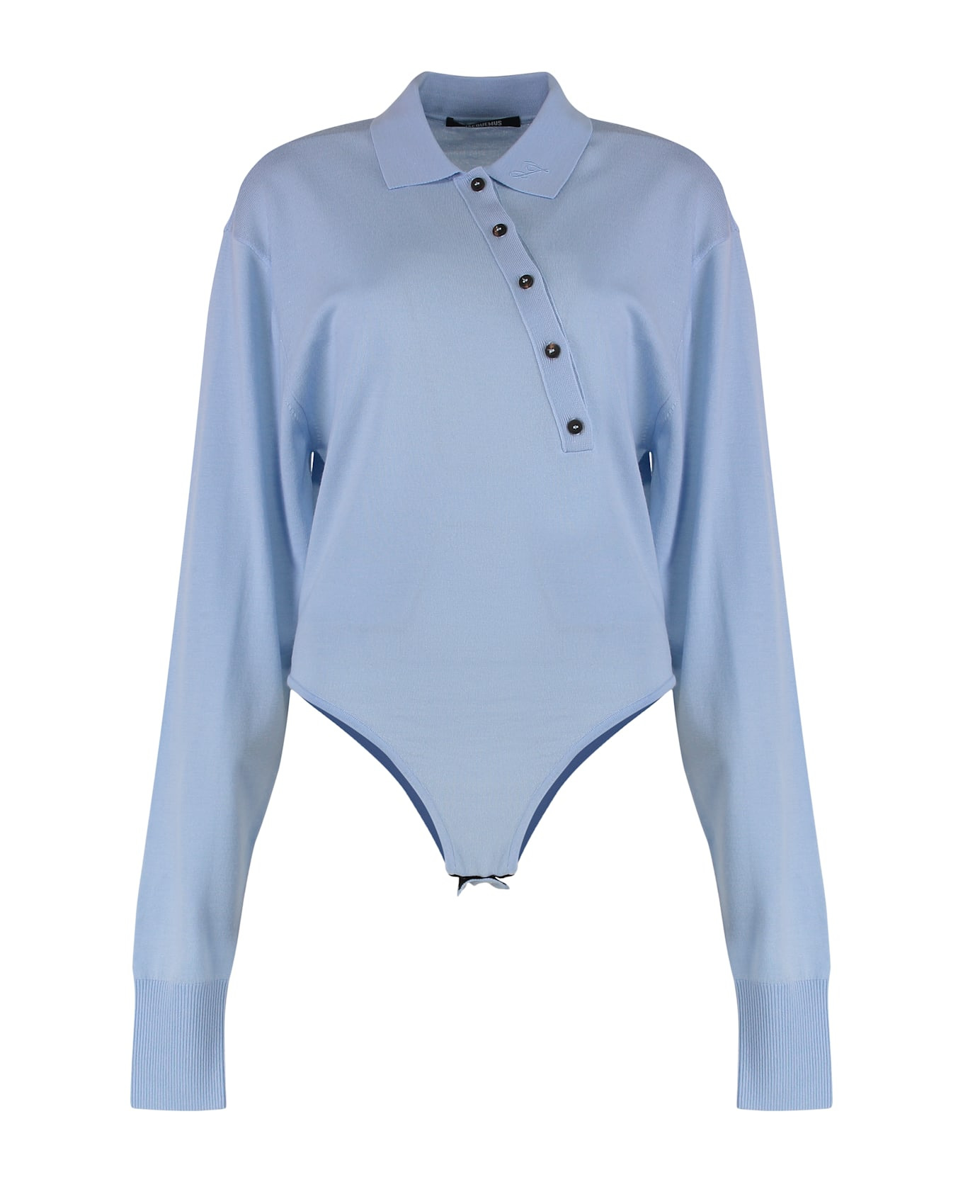 Lightweight blue fabric bodysuit with long sleeves and a polo collar. it features a symmetrical button closure at the front and a slim fit, ideal for an elegant and modern look. the bodysuit design ensures a fluid silhouette, perfect for pairing with jeans, skirts, or trousers. suitable for various occasions, from casual events to more formal situations. 100% wool Composition: 100% % Wool Made in: Romania Color: Light Blue Model number: 25HBSW00598AK00145330