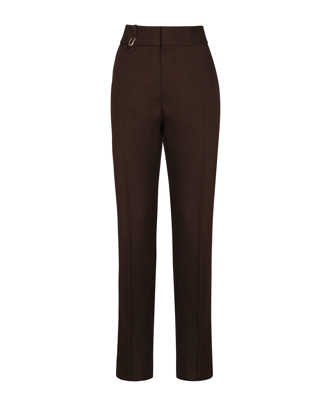 -Pants with split -High-waisted -Sartorial wool -Stapered leg with wide pleats -Side pockets -Insert with ribbon along the right side -Back welt pockets -Zip, hook-and-button fastening -Shaped hem -Size shown in photo is S -Colour: Dark brown Composition: 58% Viscose, 42% Silk Made in: Bulgaria Color: DARK BROWN Model number: 243PA0381562880