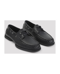 Jil Sander Black Calf Leather Loafers. Crafted from black grained leather, featuring a round toe, front piping, lace-up fastening, an embossed logo on the back, leather insole and lining, and a sporty rubber outsole. Made in: Italy Color: Black Model number: J33WR0022P7582001