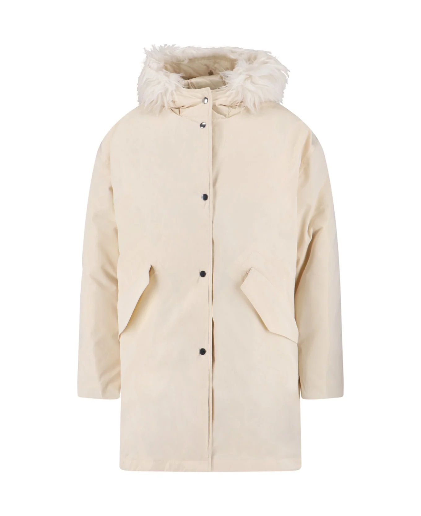 Jil Sander faux fur parka in cream fabric with hooded design, button closure, dropped shoulders, two side gusset pockets, straight hem. Composition: 100% Polyester, Lining: 100% Polyester, Lining: 100% Polyamide, Padding: 85% Goose Down, 15% Goose Feathers Made in: Italy Color: White Size and fit: - Vestibilita regolare Model number: J02AF0132J70192106