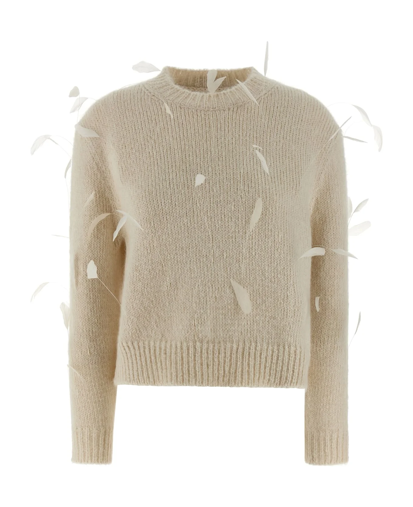 Alpaca and wool sweater with all-over tone-on-tone feather application, crewneck, long cuffed sleeves and dropped shoulder. Composition: 81% wp, 16% wv, 3% pa Made in: Italy Color: White Size and fit: - true to size fit - GERMAN size Model number: J03GP0179J14810274