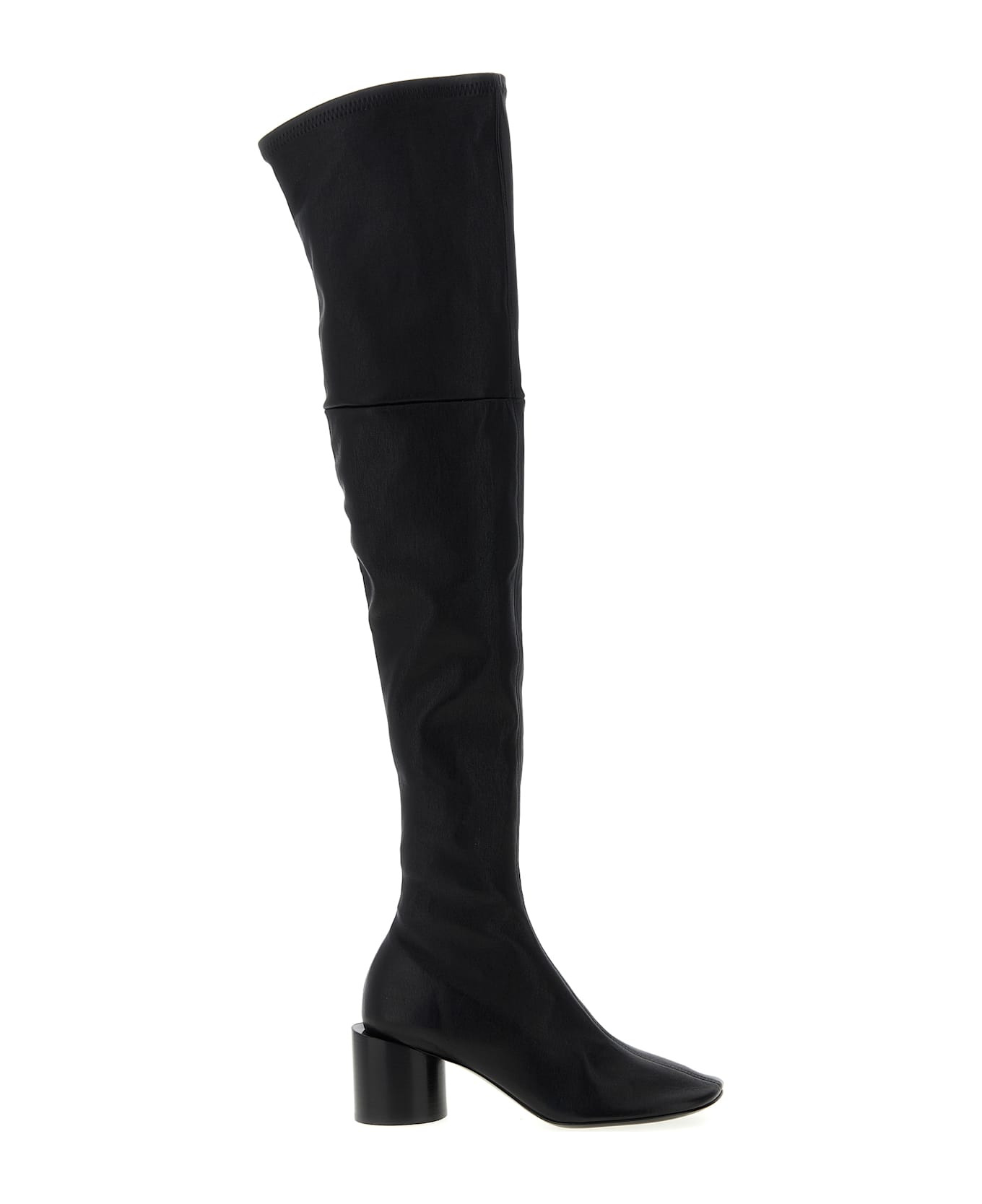 Stretch nappa leather boot, rounded toe, round wide heel, calf leather sole with added rubber. Composition: 100% leather (Ovis Aries Aries) Made in: Italy Color: Black Size and fit: - EU WOMAN - Heels: 6 cm Model number: J16WW0065P1758001