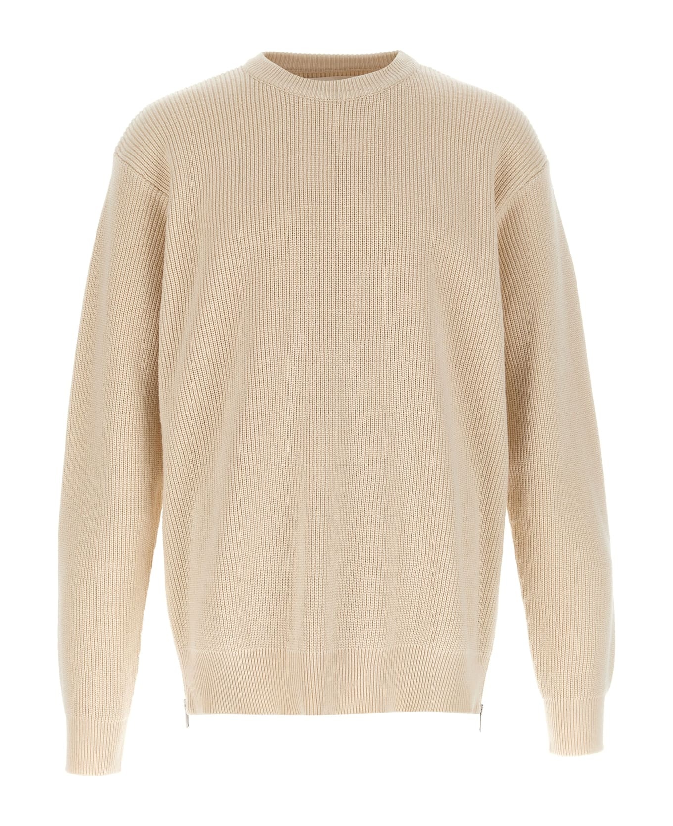 Knitted cotton sweater, crew neck, lugna sleeves with cuffs, side zip closures. Composition: 100% cotton Made in: Italy Color: Beige Size and fit: - true to size fit Model number: J47GP0164J15365102