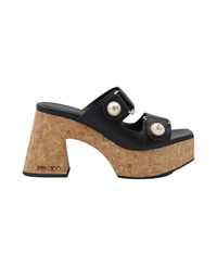 Black leather Sandals from Jimmy Choo featuring round open toe, open back, straps fastening, wedge heel and cork platform. Composition: _cover, 100% Le Sole, 100% Rubber Made in: Spain Color: Black Model number: FAYENCEWEDGE95SQM010003