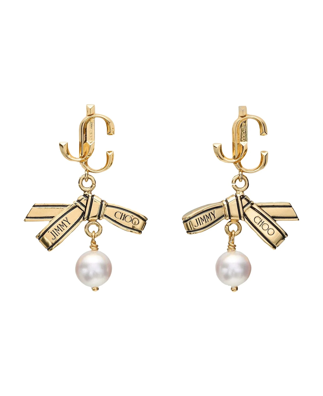 Jimmy Choo gold Ribbon pearl earrings, frontal logo, bow and pearl charm detail Composition: 100% Brass, 100% Resina Made in: Italy Color: Golden Size and fit: - UNI SIZE Model number: RBNPEARL