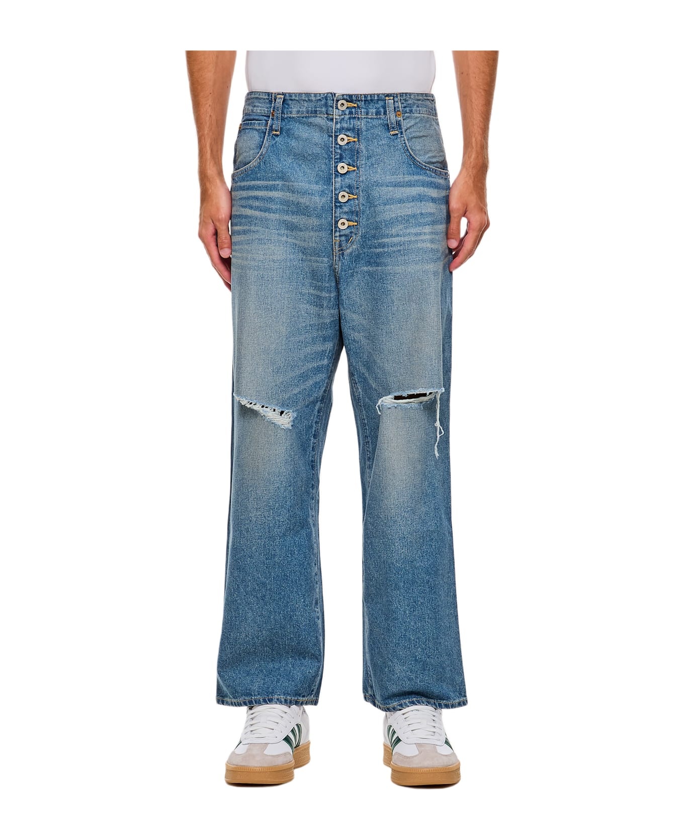 Frontal buttons closure. Side pockets. Belt loops. Ripped fabric. Color: blue. Composition: 100% Cotton Made in: Japan Color: Blue Model number: WNP0190511