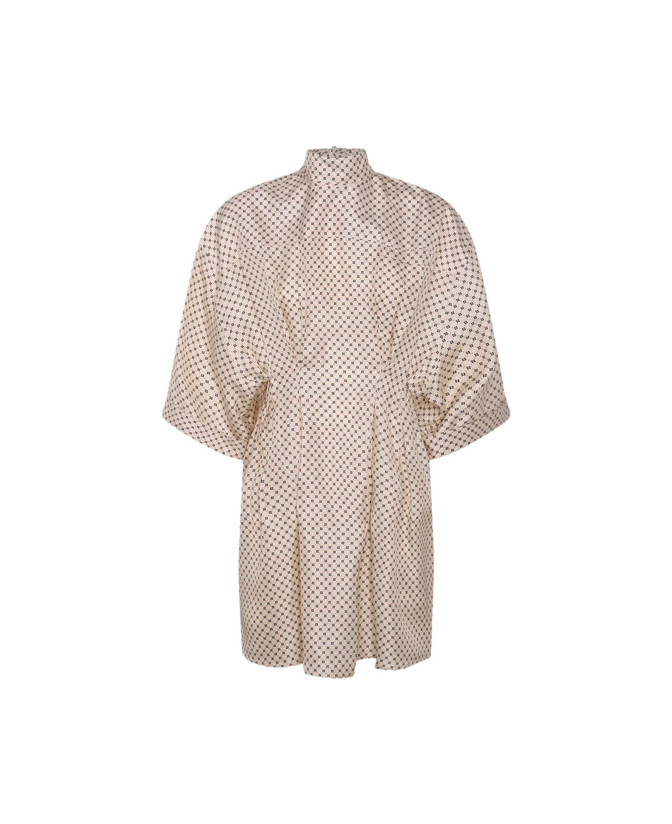 Beige silk dress from Lanvin featuring high collar, kimono sleeves with flap, knee length, frontal pince, all over geometric pattern and back lace for closure. Composition: _, 100% Silk Made in: France Color: CHALK Model number: RWDR00405690002
