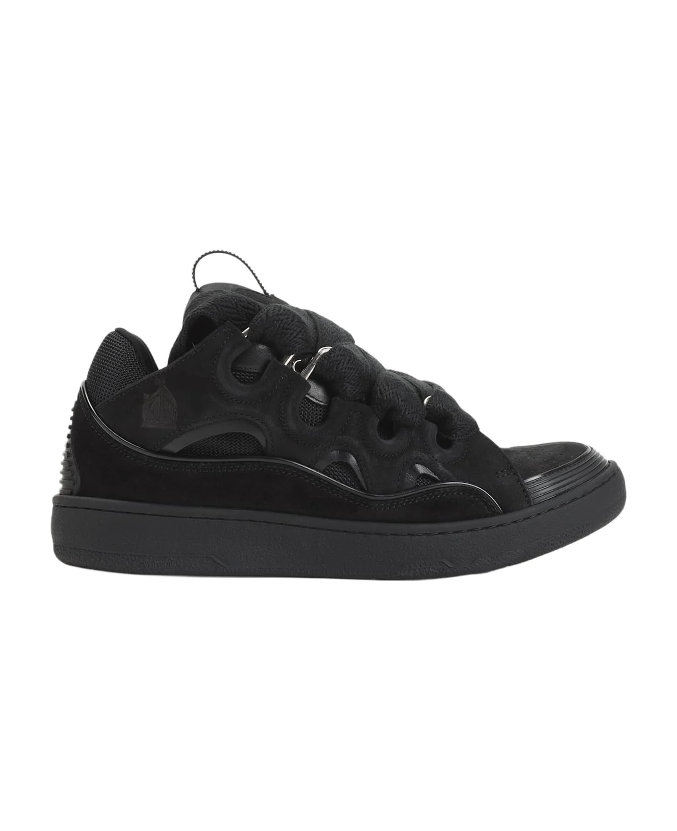Lanvin Curb Black Calf Leather Sneakers. 90s-inspired sneakers, the multi-layer vamp is crafted from black calf leather and mesh with tonal suede leather and rubber inserts. They feature an almond toe, a woven double lace fastening, a padded tongue with branded plaque, branded textile lining and insole, and a black rubber outsole. Made in: Portugal Color: Black Black Model number: FUSKDK12DRAGP251010
