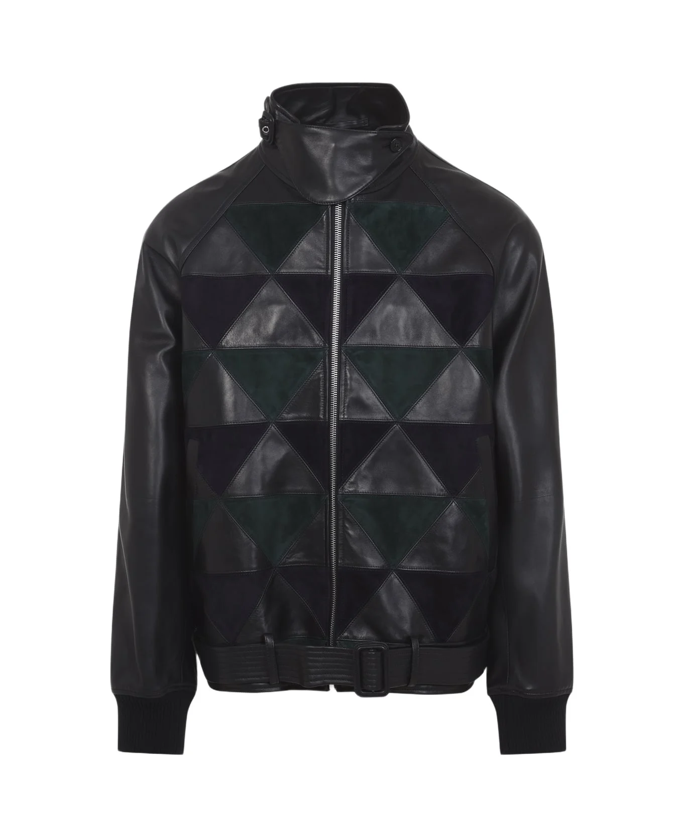 Lanvin Intarsia Black Calf Leather Bomber Jacket. Crafted from black calf leather, with a geometric detail on the front composed of blue and green suede leather inserts, it features a standing collar with an adjustable strap, long raglan sleeves with ribbed cuffs, a belted waist, and a long back yoke, and is fully lined. Made in: Italy Color: Black Model number: RMCO0431L063H2510
