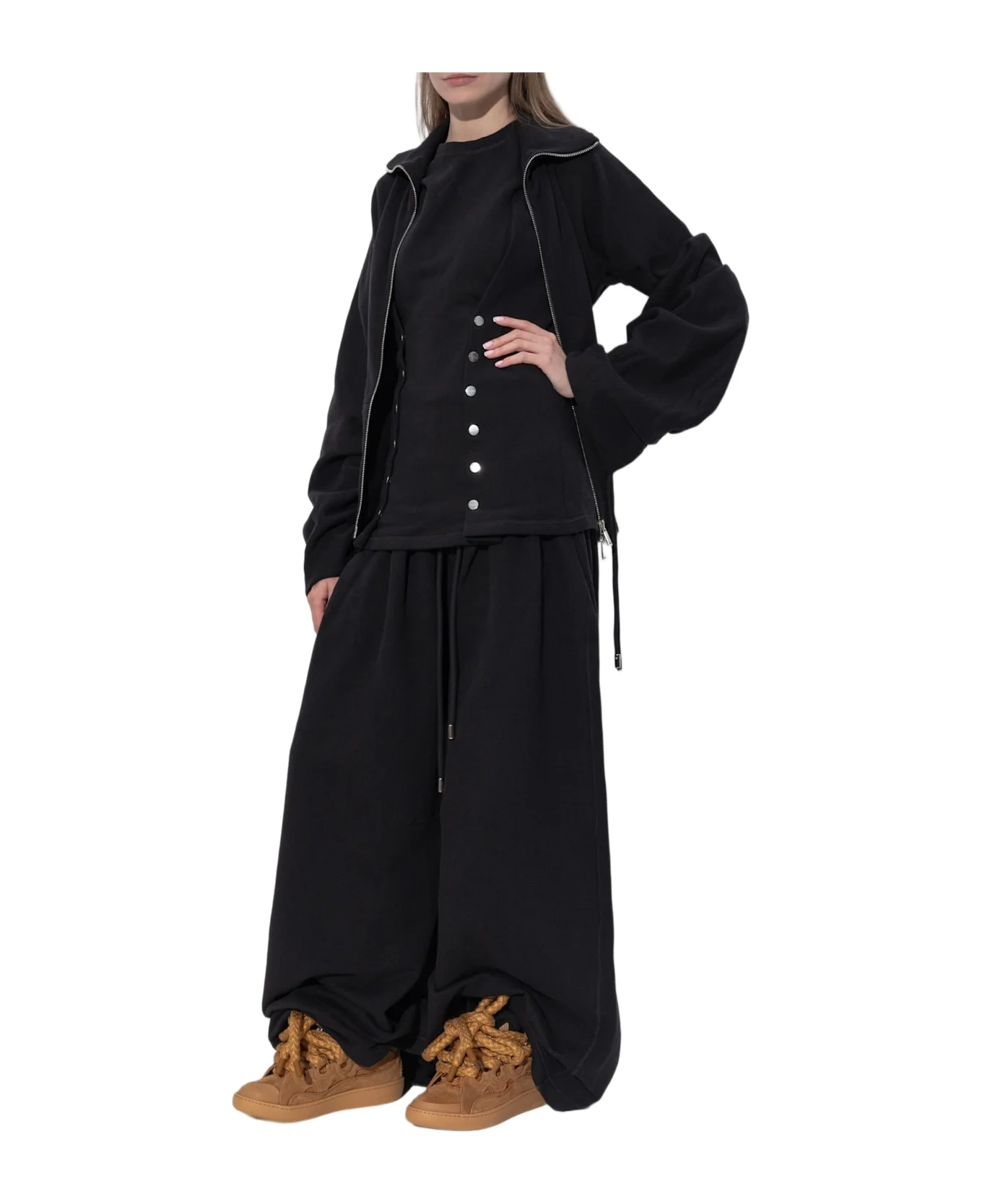 Epitomizing contemporary sophistication, this Lanvin sweatshirt with decorative ruching on the sleeves is a refined statement of modern elegance. Crafted from a sumptuously smooth blend of premium cotton and cashmere, its fabric offers a softly matte finish and a luxurious feel against the skin. The silhouette is expertly tailored, gently fitted at the waist with a subtly flared hem, while billowing sleeves feature striking, adjustable ruching artfully accentuated by metal-tipped drawstrings for a unique, avant-garde touch. The minimalist, single-tone composition is enhanced by a full-length metal zipper and a sculpted high stand collar, elevating both the utility and visual intrigue of this piece. Uniting heritage workmanship and innovative design, this garment is a true reflection of Lanvin's celebrated Parisian legacy. Why choose this product? Exclusive cotton-cashmere composition ensures exceptional comfort and warmth Distinctive adjustable ruching and metal accents define its originality Minimalist silhouette flatteringly enhances the waistline Functional, decorative metal zipper adds a luxurious modern touch Designed by Lanvin, Paris's most historic haute couture house Composition: 90% Cotton 10% Cashmere Color: Black Model number: RWJA0015