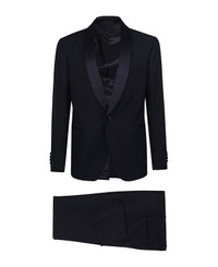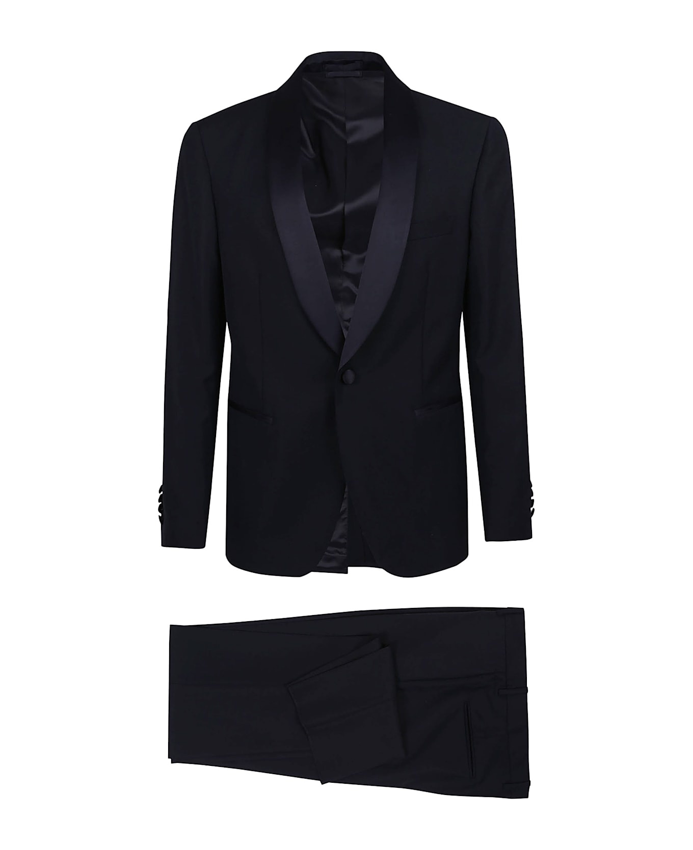 Dark blue tuxedo suit in opaque ottoman fabric with shawl collar, covered buttons and narrow fit with trousers in the same fabric with classic tuxedo leg Made in: Italy Model number: ES5918E1ESE64315850