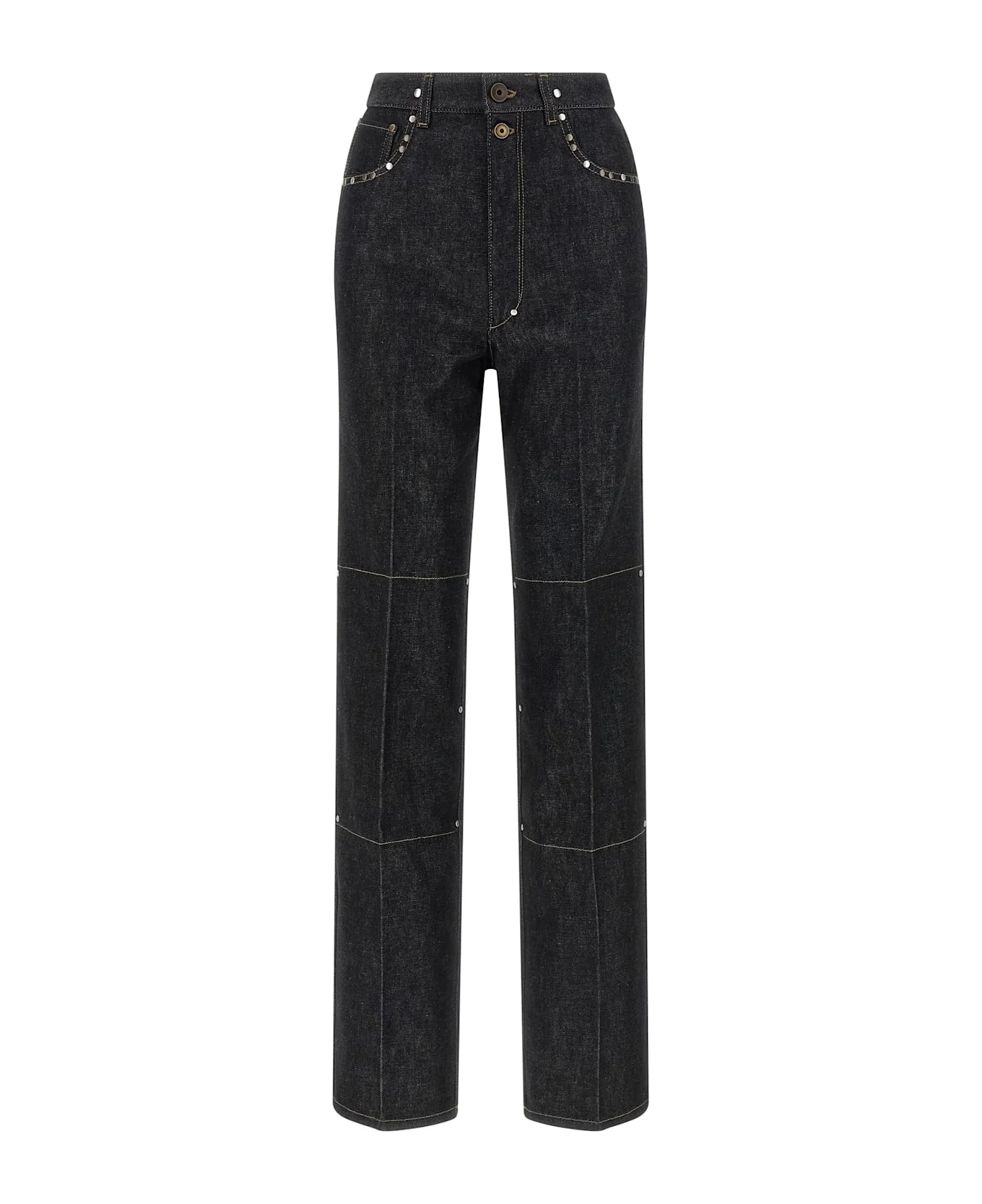 Heavy denim jeans with metal rivets of different sizes, contrast stitching, high waist, straight leg, stretched pleat, front zip and button closure, five pockets, leather logo label with embossed logo at the back. Composition: 100% cotton Made in: Italy Color: Black Size and fit: - True to size fit - LEMAIRE size Model number: PA1303LD1061BK965