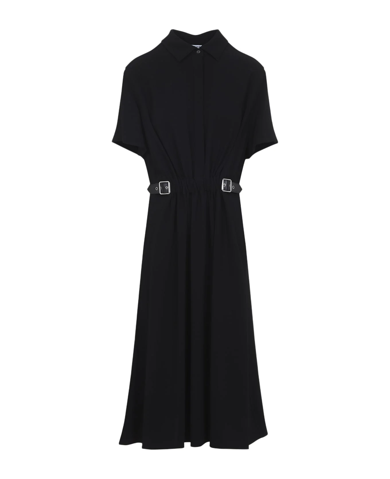Loewe Belted Black Viscose Midi Dress. Midi dress crafted from black fluid viscose cady, featuring a pointed collar, front button fastening, a gathered front with a leather belt detail, and an embroidered logo at the back. Made in: Italy Color: Black Model number: S540Y09XTW1100