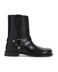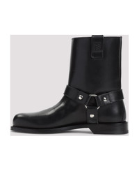 Loewe Black Cowhide Campo Biker Shearling Boots. Pure black cowhide boots, round toe, ankle leather strap, silver-tone metallic buckle and studs, ankle-high, slip-on style, tonal shearling lining, tonal sole. Biker design. Made in: Italy Color: Black Model number: LSS4285X011100
