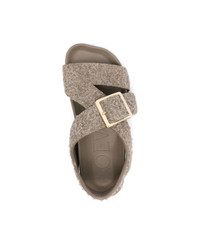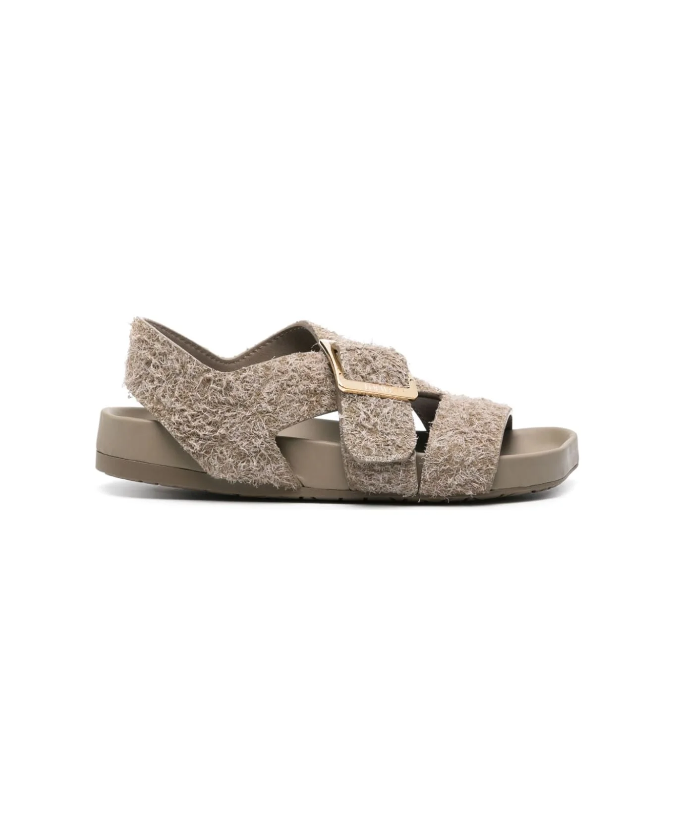 khaki calf suede square open toe crossover strap at the toe branded leather insole rubber sole side buckle fastening with logo-engraved buckle Composition: Lining: Calf Leather, 100% , Sole: Rubber, 100% , Outer: Calf Suede, 100% Made in: Italy Color: Kaki Size and fit: - W Heel 1,1 in / 2,8 cm x H x D cm handle Platform 0,3 in / 0,8 cm Model number: L814465X944160