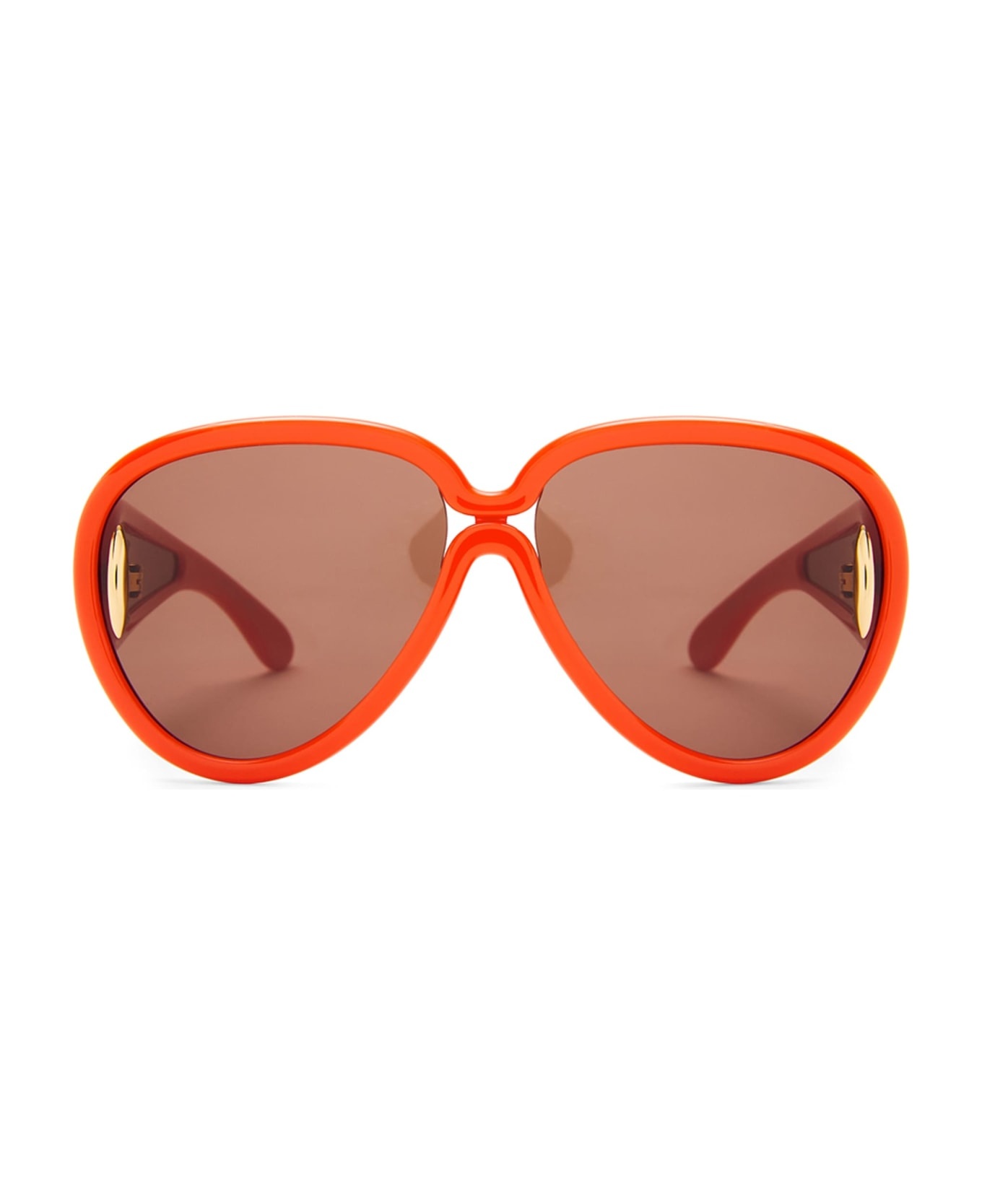 Loewe PILOT MASK - SHINY ORANGE (LW40132I6542E) are pilot sunglasses made in Italy. They feature orange injected nylon structure, iconic temples with lenses, Loewe golden emblem logo, and brown lens with 100% UV protection. Made in Italy - Color: orange - Material: acetate - Lens: brown - Shape: pilot - Size: eye 65mm / bridge 14mm / temple 145mm Made in: Italy Color: orange Model number: LW40132I6542E