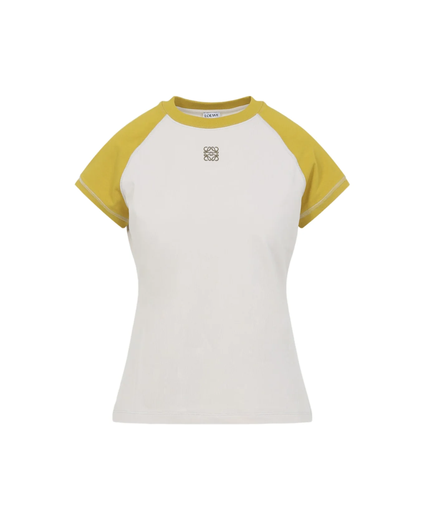 Loewe Small Fit Yellow Cotton T-shirt. Small-fit T-shirt crafted from white cotton and viscose jersey, featuring a contrasting yellow top panel, a round neckline, short raglan sleeves, a logo patch on the front, and a straight hem. Made in: Portugal Color: Mustard Bronze Model number: S540Y22X76142