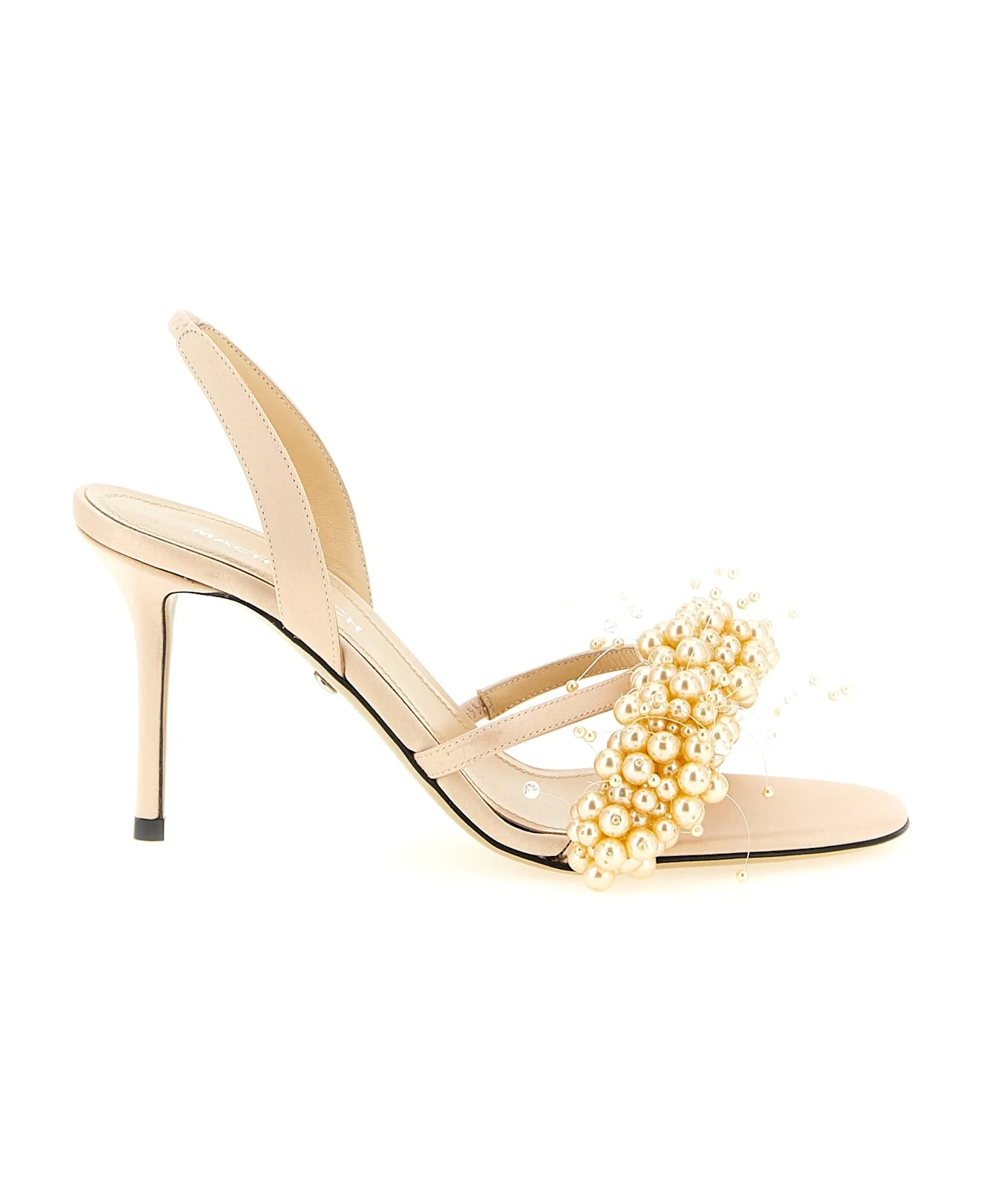 Satin sandal, front band with hand-stitched 'Floating Pearl', straps with elastic insert, heel, leather sole. Composition: 100% satin Made in: Italy Color: Gold Size and fit: - EU WOMAN - Heels: 8,5 cm Model number: SS26S100285CRPLGD