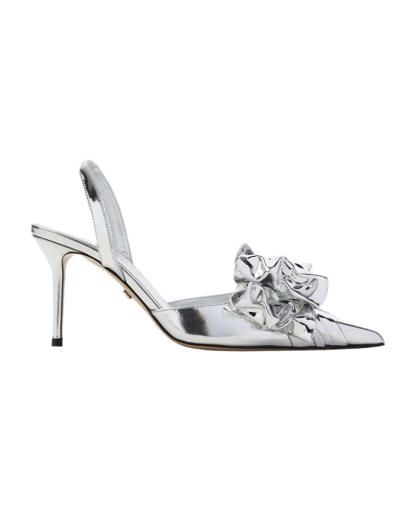 Mach & Mach Silver Leather Le Cadeau Silver Wrapped Leather Pumps. Pure silver leather pumps, pointed toe, top tonal bow detail, ankle strap, thin high heels, leather sole. Made in: Italy Color: Silver Size and fit: - Heel Hight: 8,5cm Model number: FW25S094985SPESLVSILVER