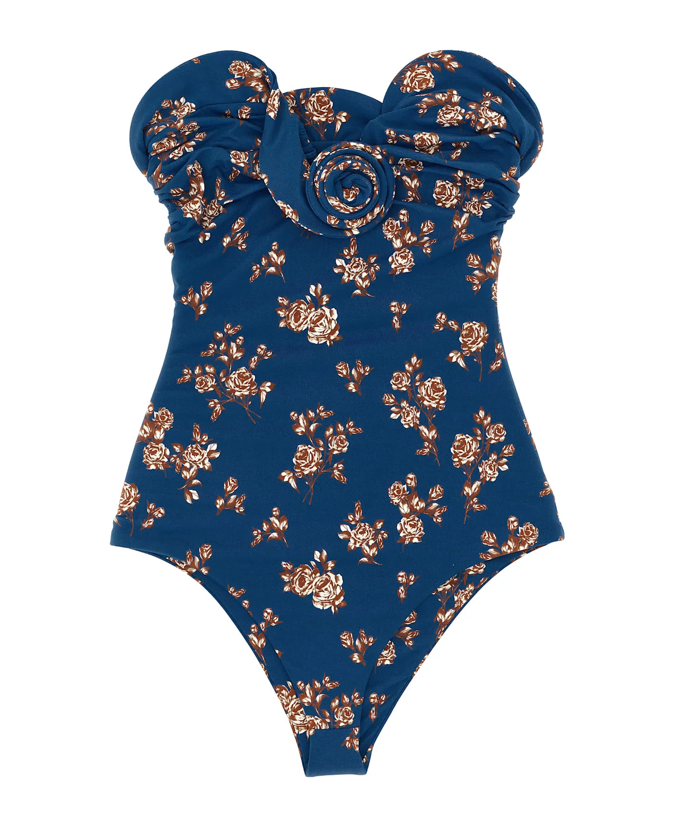 One-piece swimsuit '05' in stretch fabric with floral print, off-the-shoulder model, sweetheart neckline with front flower and hints of ruffles with wire structure, thin adjustable and removable straps, leggy. Composition: 86% polyamide, 14% elastane Made in: Italy Color: Blue Size and fit: - true to size fit - FRENCH size Model number: 806526BLUE