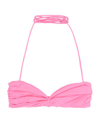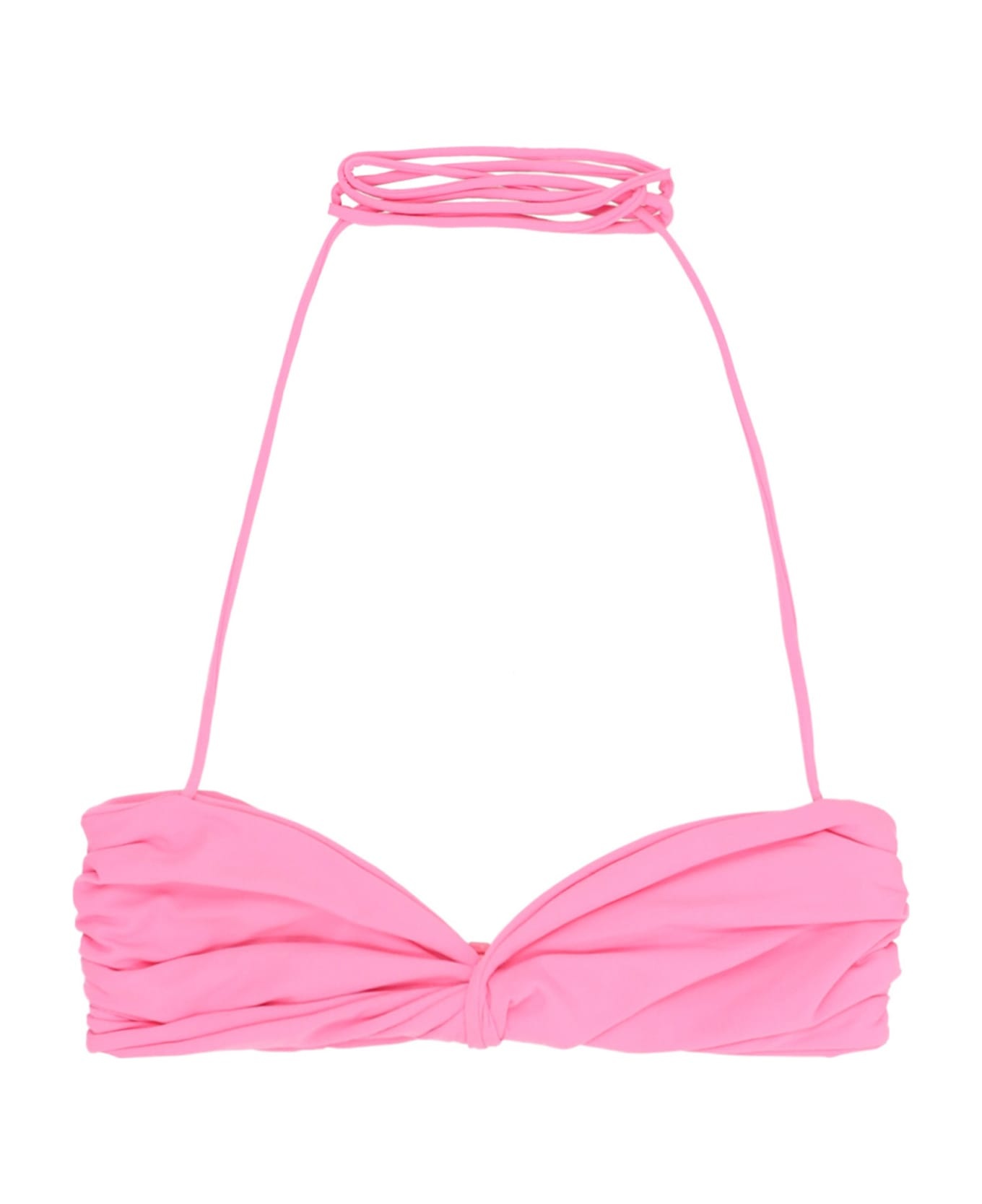 Stretch fabric bikini top with front knot detail, ties on the neck, and a hook at the back. Composition: 86% polyamide 14% elastane Color: Pink Size and fit: - True to size fit French sizing Model number: 811722PINK