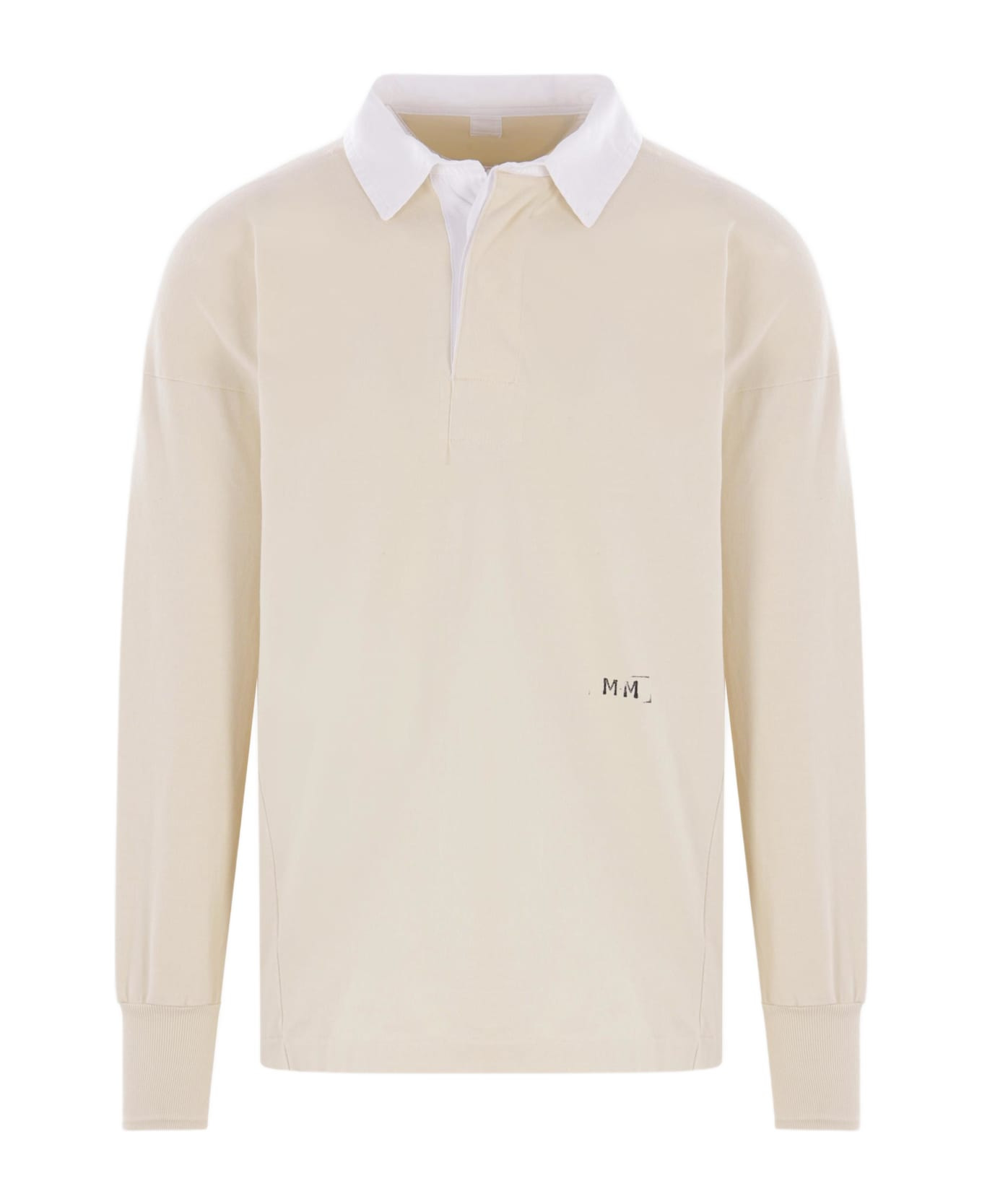 Maison Margiela polo made of ivory cotton jersey with a front MM print. Featuring a polo collar, two-button placket, long sleeves with ribbed cuffs and a straight hem. The design is finished with the Maison's iconic four stitches on the back. Composition: 100% cotton Made in: Italy Color: IVORY Size and fit: - Regular Fit - True to size Model number: S51GL0056M20096103
