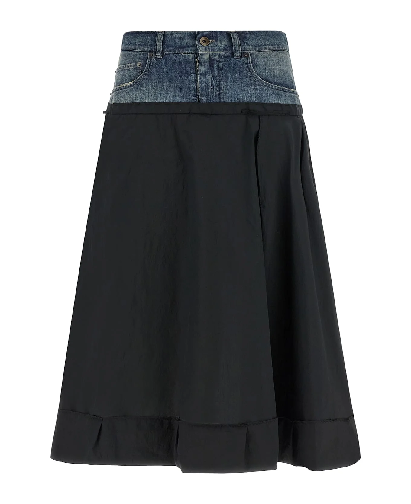 Midi skirt in wrinkled satin-effect fabric, inside-out reverse construction, flared silhouette, trompe l'oeil jeans insert at the waist in cotton denim, hook and front zip button closure, five pockets, 'Four Stitches' at the back, turn-up with raw cut hem on the hem. Composition: 75% polyester, 25% polyamide Made in: Italy Color: Multicolor Size and fit: - true to size fit Model number: S51ME0049MTN142900