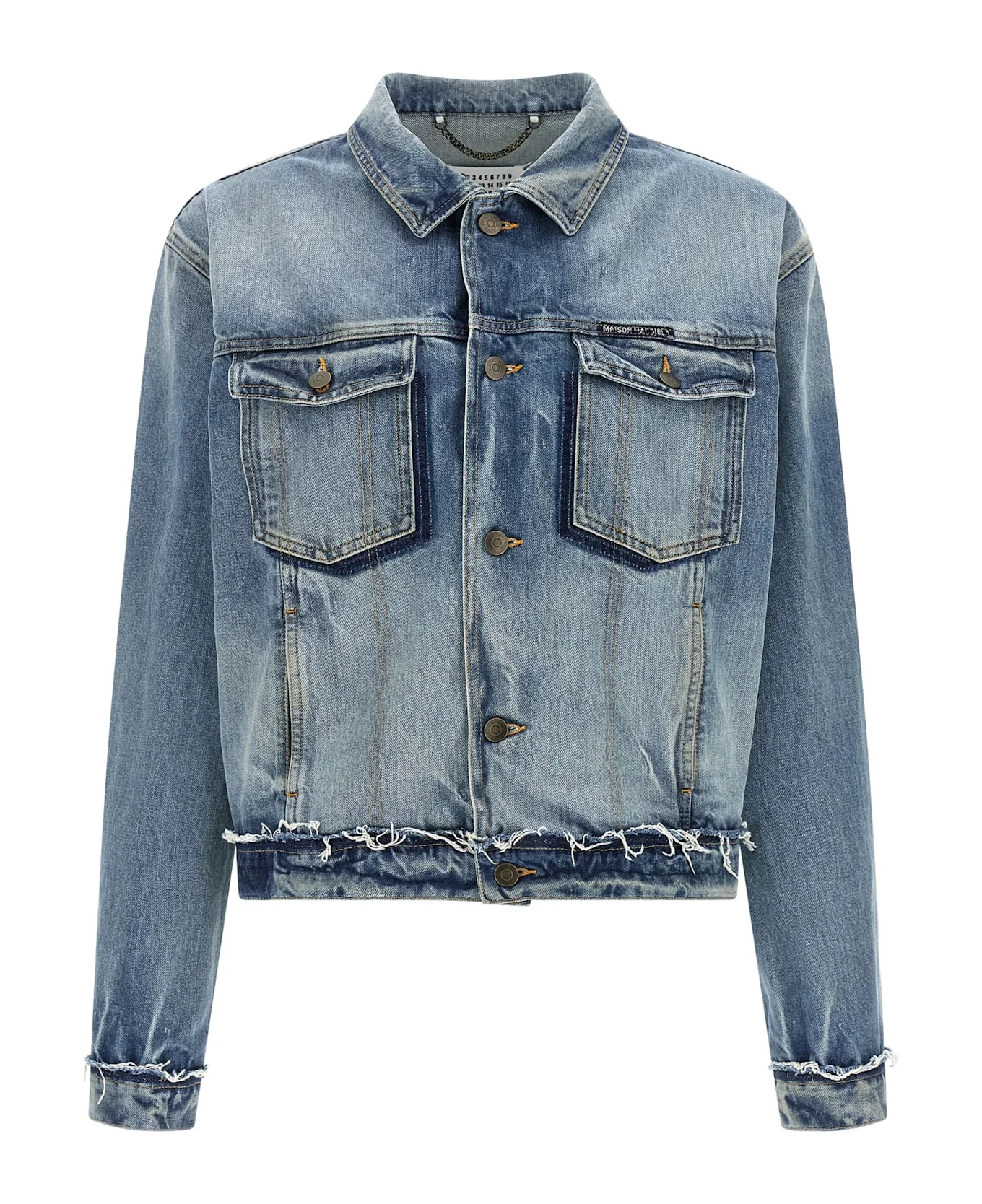 Used-effect washed cotton denim jacket, contrast stitching, frayed hems, shirt collar, front button closure, pockets, long cuffed sleeves, back 'Four Stitches'. Composition: 100% cotton Made in: Italy Color: Light Blue Size and fit: - true to size fit Model number: S51AM0517S30561987