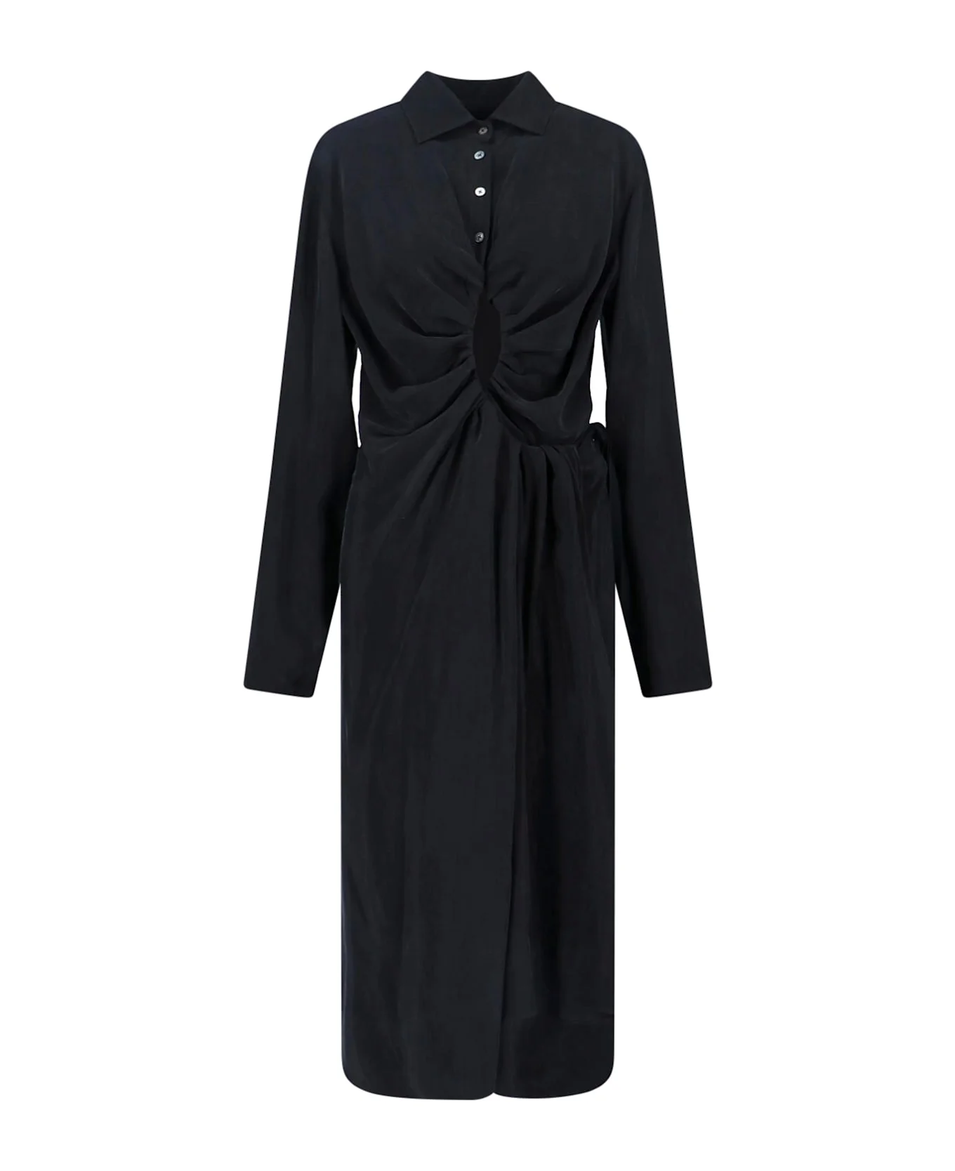 Maison Margielain black cupro draped midi dress with collar, long sleeves, button closure, cut-out detail on the front, Four Stitches stitching on the back. Composition: 100% Cupro Made in: Italy Color: Black Size and fit: - vestibilita regolare Model number: S29DD0057M35901900